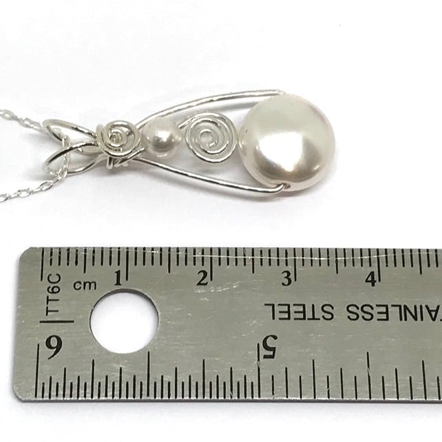 I have created this pendant with sterling silver wire, a 12mm white coin pearl, a 6mm white round glass pearl. The pendant is finished with silver swirls created with the sterling silver wire.