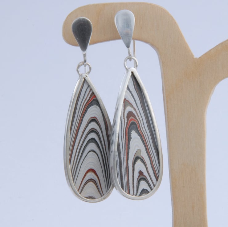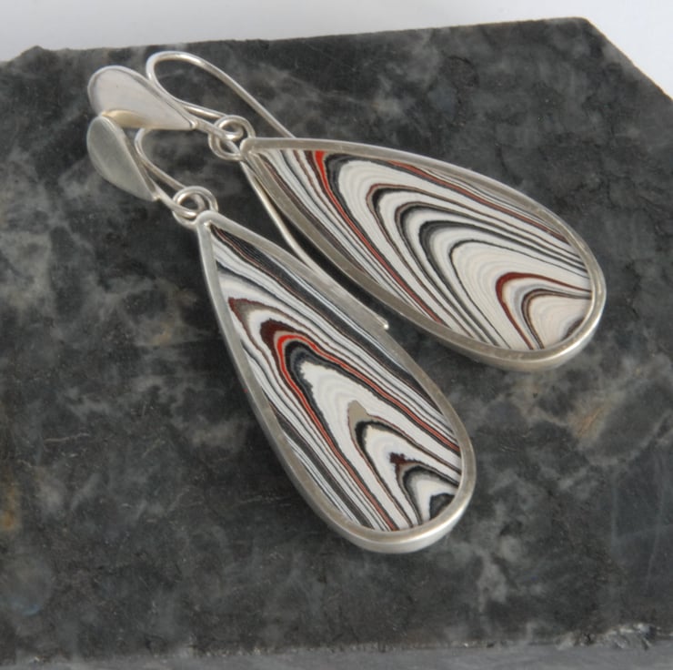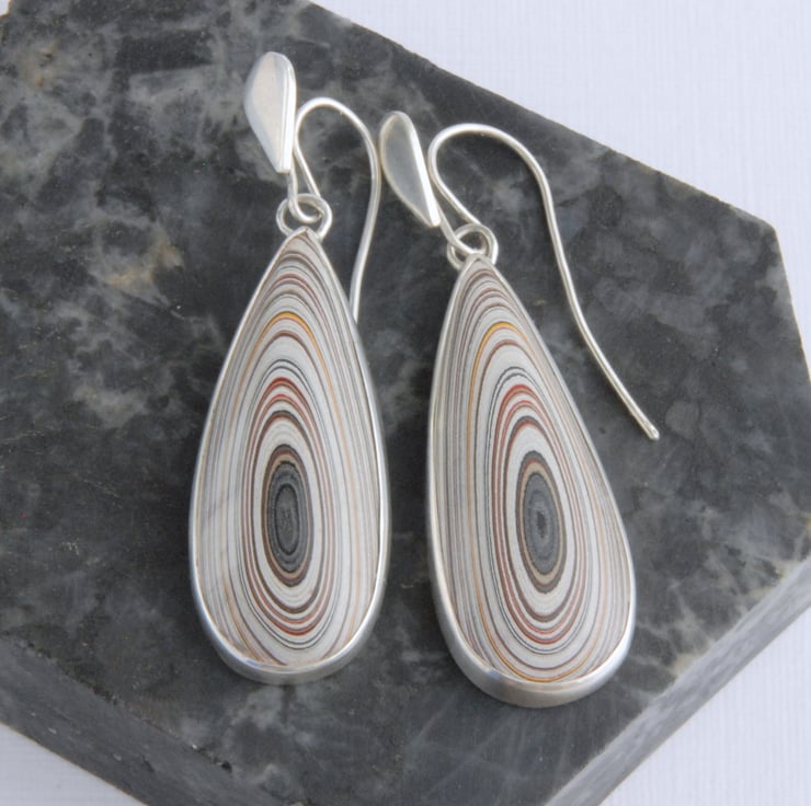 These sterling silver earrings feature reversible drops of bezel set fordite - when they are not being worn the drops can be slid off the back of the hooks and turned around revealling the different pattern and colour palette on the back. The front has a finely banded bullseye pattern in white, red, yellow and grey, the back a wider chevron pattern in black, white, and red. So what is fordite? Fordite is an accidentally made industrial by product (so this is a great bit of upcycling) - when car panels were painted over spray paint would slowly build up in the booths layer by differently coloured layer. After it had been baked numerous times it had to be removed and some bright spark realised that it could be cut and polished to show the interesting pattern and numerous colours. The material in these earrings came from one of the Detroit factories in the early 2000's. Changes to the way cars are painted mean that this material is no longer formed and it is becoming harder to come by.