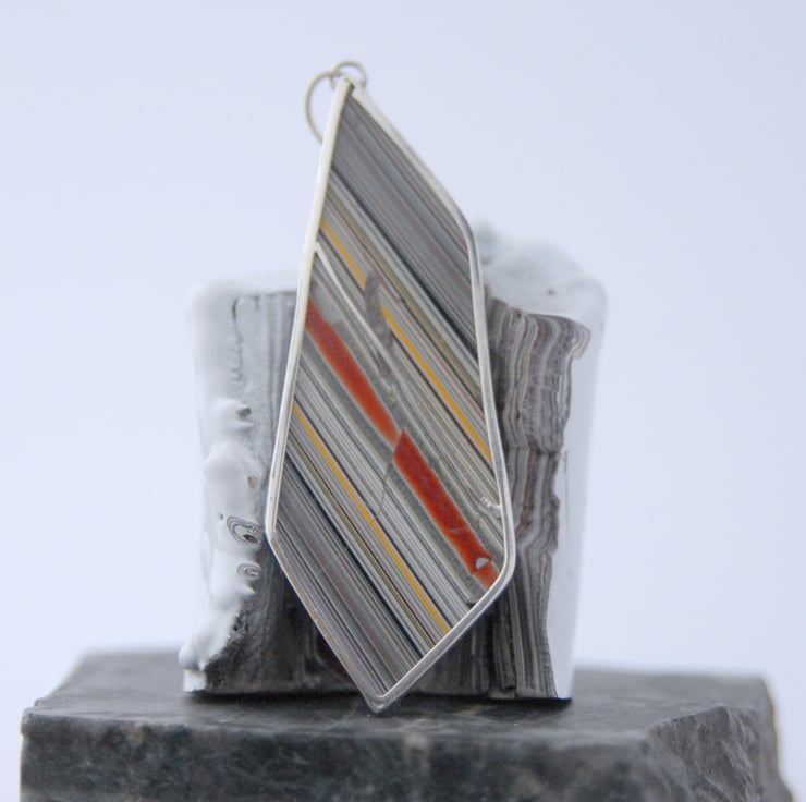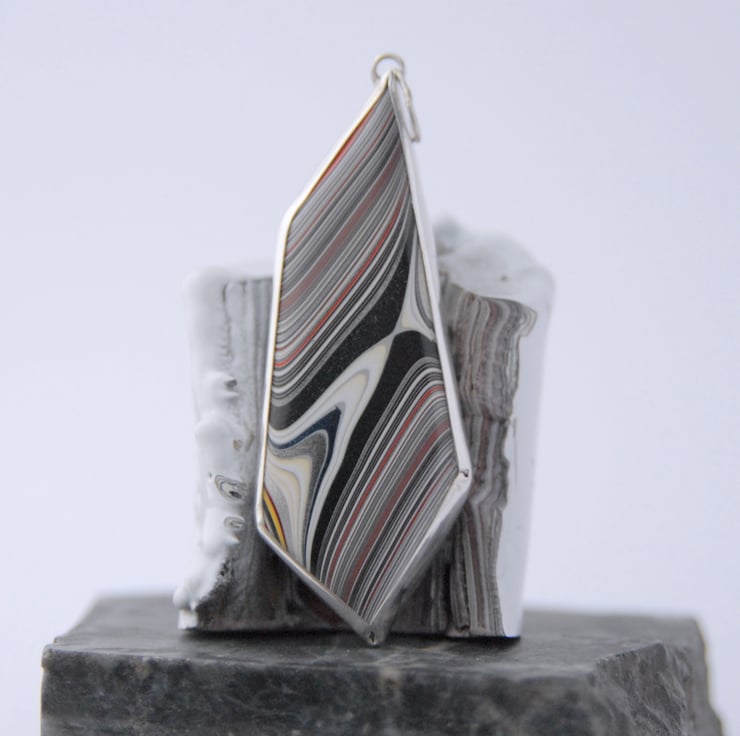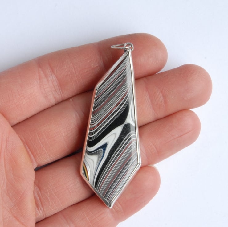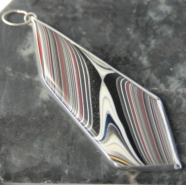 This pendant is sure to make a statement thanks to its large size, unusual irregular pentagonal shape and the fact that its a strikingly patterned piece of fordite bezel set in sterling silver. It has a stripy pattern in sparkly black, silver, red, blue and white and can be reversed to show a completely different stripy pattern this time in red, yellow, grey and black. So what is fordite - its layer on layer of car paint that built up on the rails in the old spray booths when car panels were still manually sprayed. After it had been through the curing ovens it became hard and had to be removed - these chunks became fordite and the beauty of the material was revealed when lapidrists got hold of it to cut and polish to show the different layers and colours. Fordite can be approximately aged based on the range of colours and number of sparkly layers it has, this material has lots of sparkles but a more limited range of colours suggesting it was formed in the late 90's (later material had fewer colours, earlier material more), it has come from one of the plants near Detroit hense its alternative name of Detroit agate.