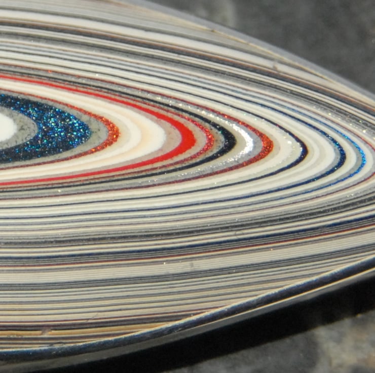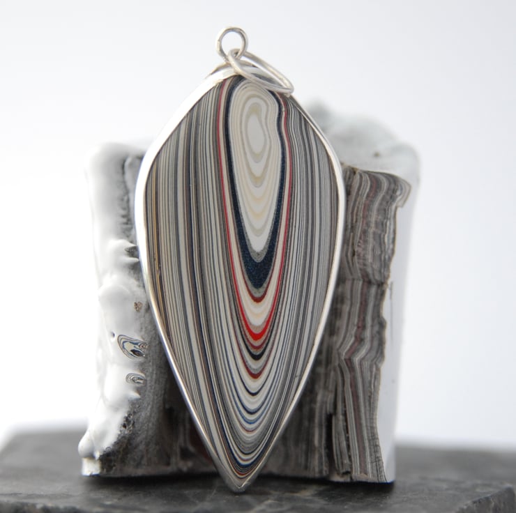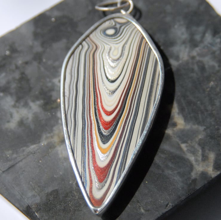 This striking pendant features a sheild shaped piece of fordite which is bezel set in sterling silver. The pendant is reversible as I couldn't decide which size was the front, side one has an off centre bullseye pattern in white, grey, sparkly navy, red and silver, the other side has a broader chevron pattern in yellow, sparkly red, black, silver and white. So what's fordite? It is layer upon layer of cured car paint that built up in the booths when cars were still manually sprayed, each different colour is from where a car was being painted. This material came fromone of the car plants near Detroit hense its alternative name of Detroit agate and was formed in the 90's (ideal present for any 90's baby or car lover). Changes to the way cars are painted mean that this wonderful material is no longer formed and supplies are dwindling, I cut and polish this material myself and you can just see a piece of the rough propping up the pendant in the first 2 photos.
