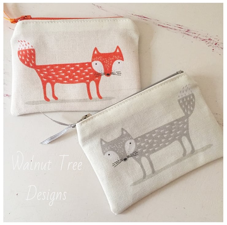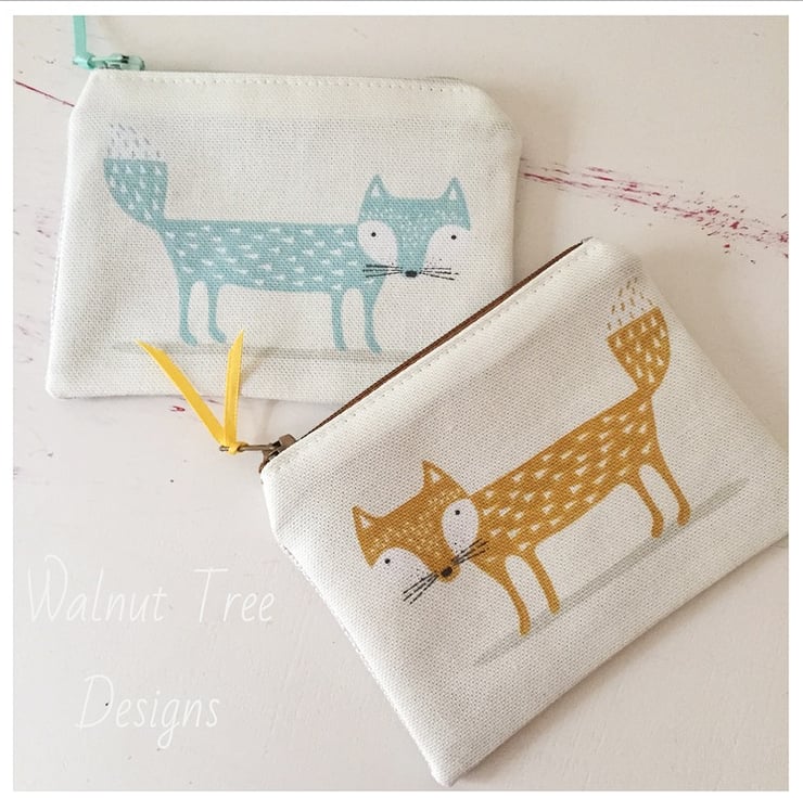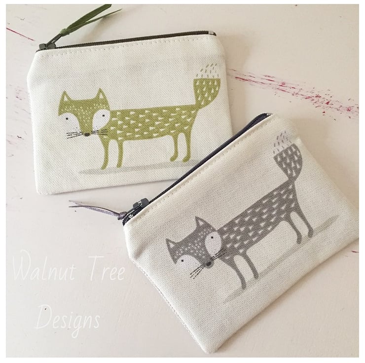 Fox design purse, ideal for coins, cards or other small items. Fox design on front panel with an oatmeal linen on the reverse. Lined with matching polka dot fabric.