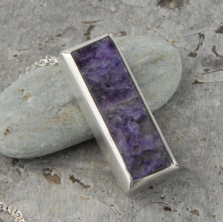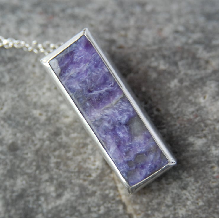 This sleek modern pendant features an oblong of purple charoite bezel set in sterling silver which hangs from a delicate silver chain via a hidden bail. Charoite is a purple stone that comes from a particular region of Russia on the banks of the Chara river, it has a non uniform crystal structure leading to variations in colour from pale lilacs to deeper purples and a slight shimmer. I think this would make a lovely unusual alternative to amethyst jewellery.