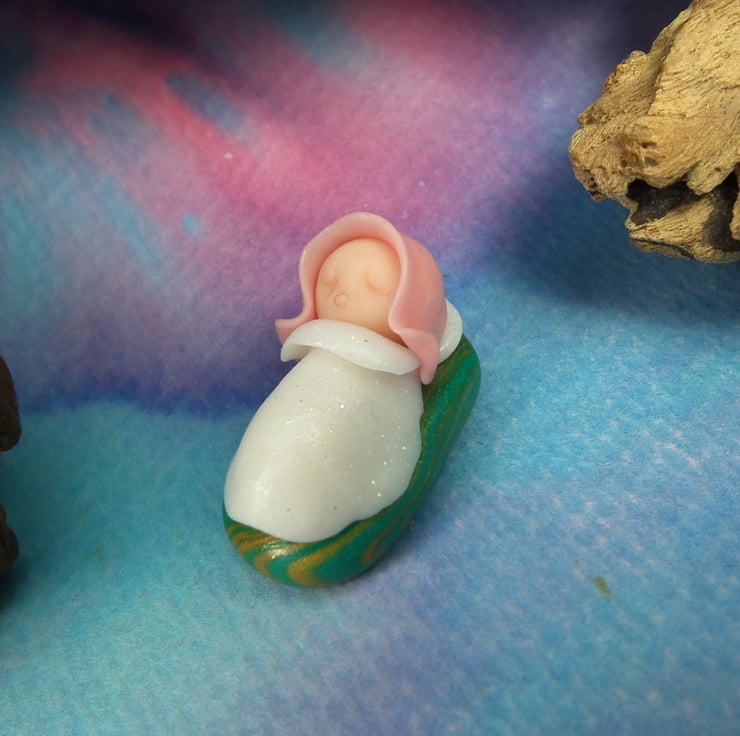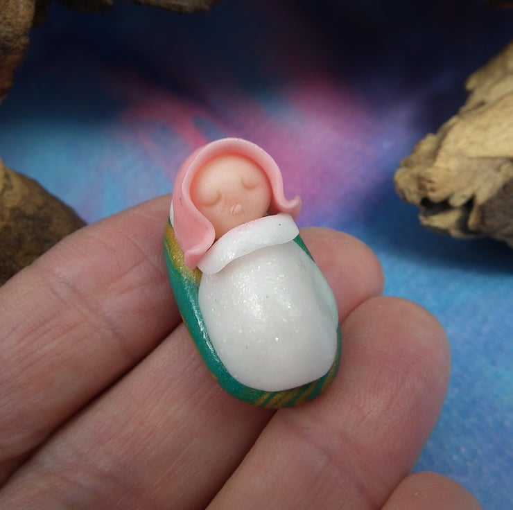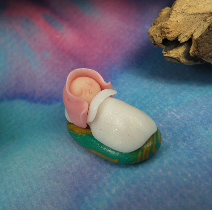 This is a 'one of a kind' creation having been entirely handmade without the use of moulds here at my studio on the Sussex Coast. Modelled with Prosculpt polymers, painted with heat set paints before sealing with lacquer. Dilly the Baby Gnome in her crib is just one inch long.