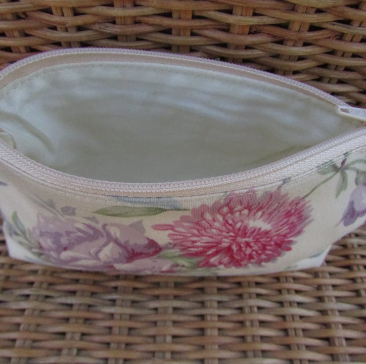 A large purse in a pretty fabric with a floral print pattern featuring a pink flower and a purple flower on a cream background. The coin purse has a cream zip and is lined with cream fabric. The base of the purse is boxed to give extra space inside.