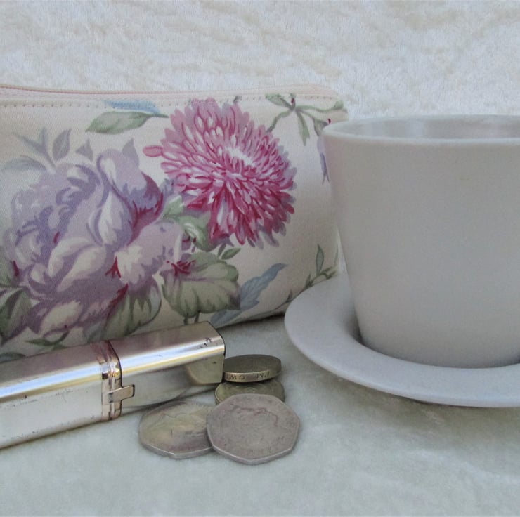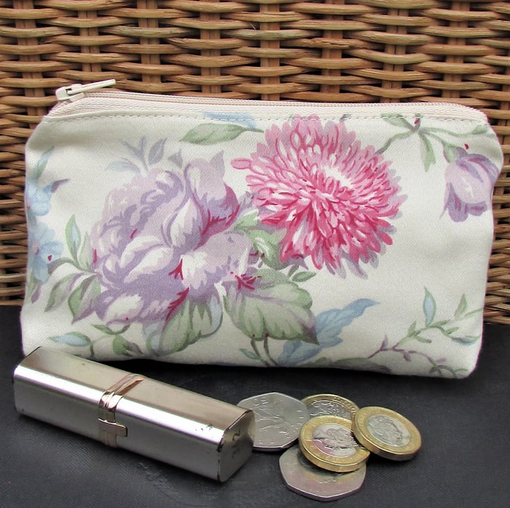 This large purse could be used as a coin purse and is large enough for bank cards and keys. It is also large enough to be used as a small make up bag or as a mobile phone pouch. With its pretty floral pattern, it would make an ideal gift, perhaps for a keen gardener.