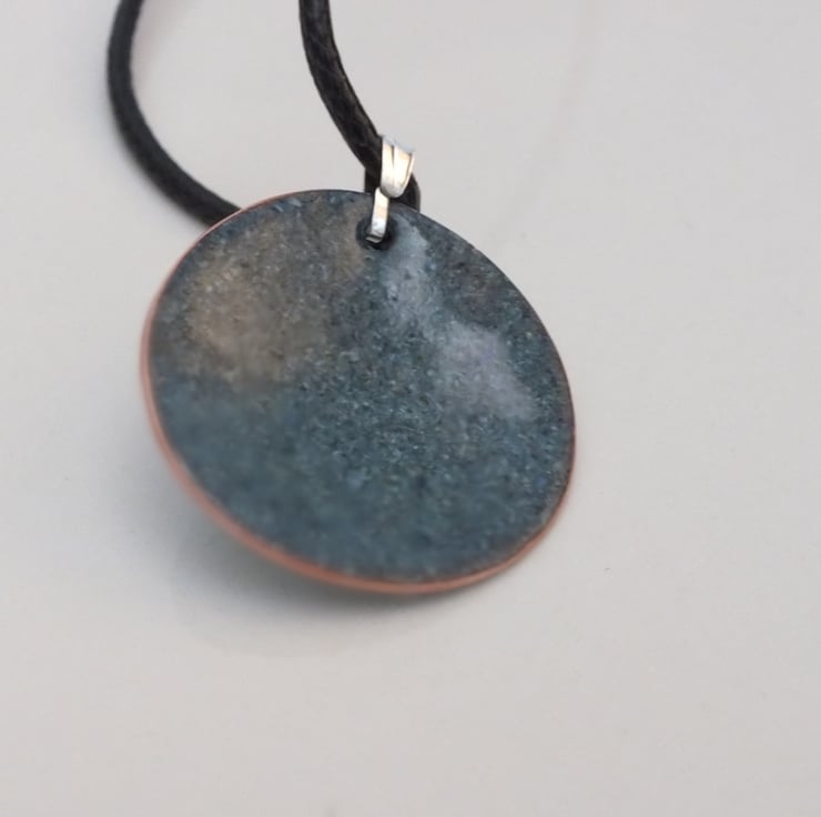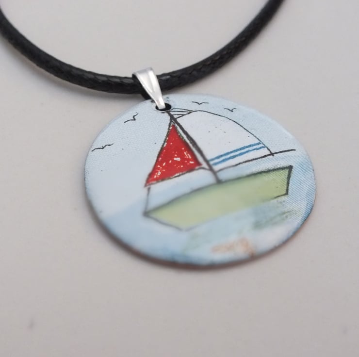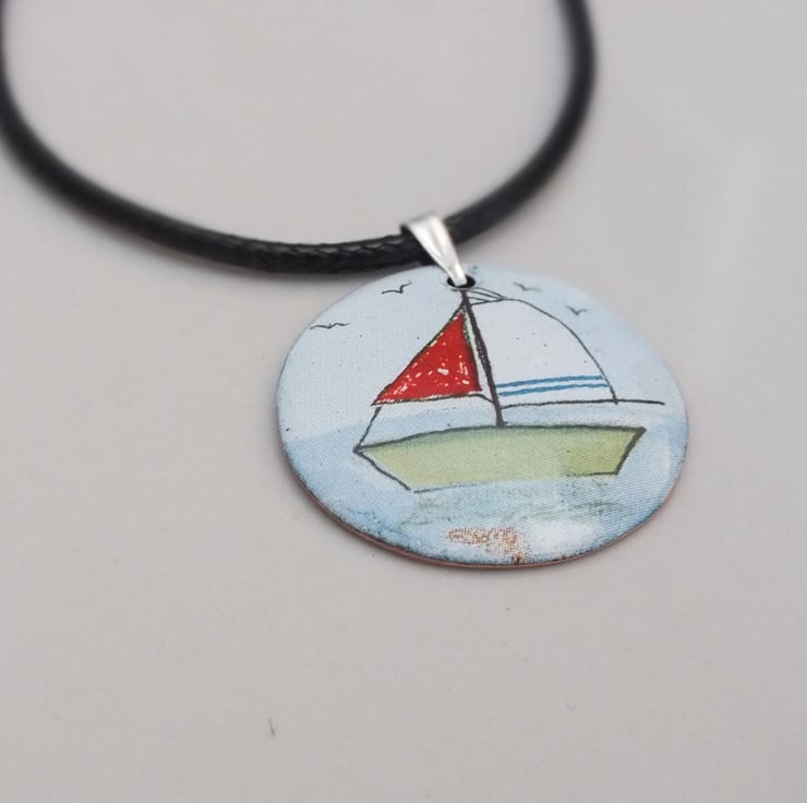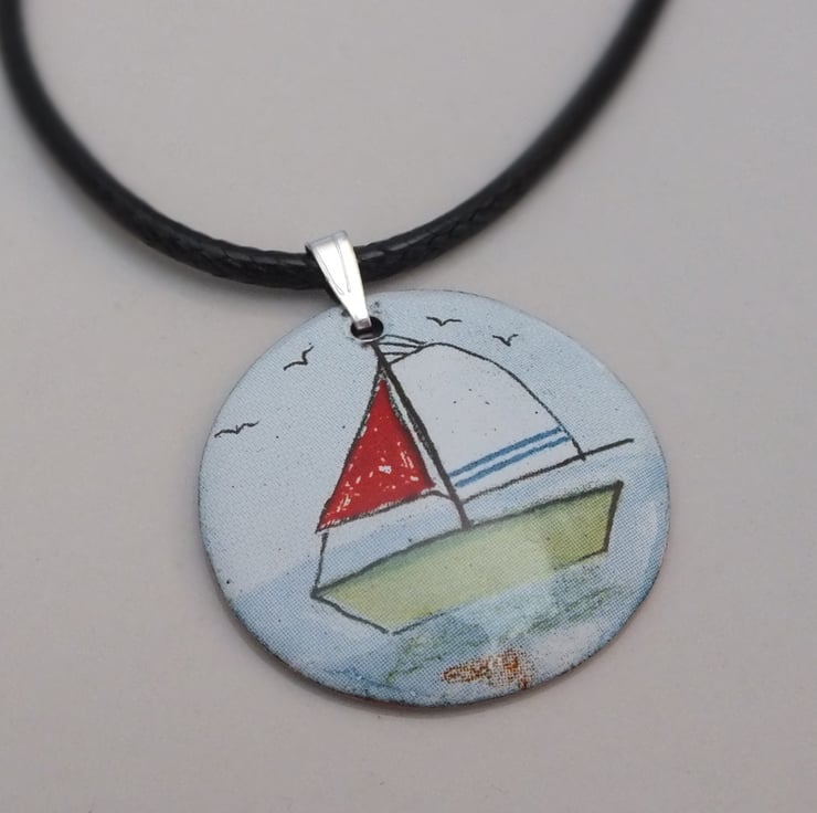 Enamelled copper pendant, featuring a drawing of a green sailing boat, with red and white sails. The pendant is slightly domed, measures 3cm in diameter and is counter-enamelled on the back. It is supplied with a 45cm black waxed cotton cord.