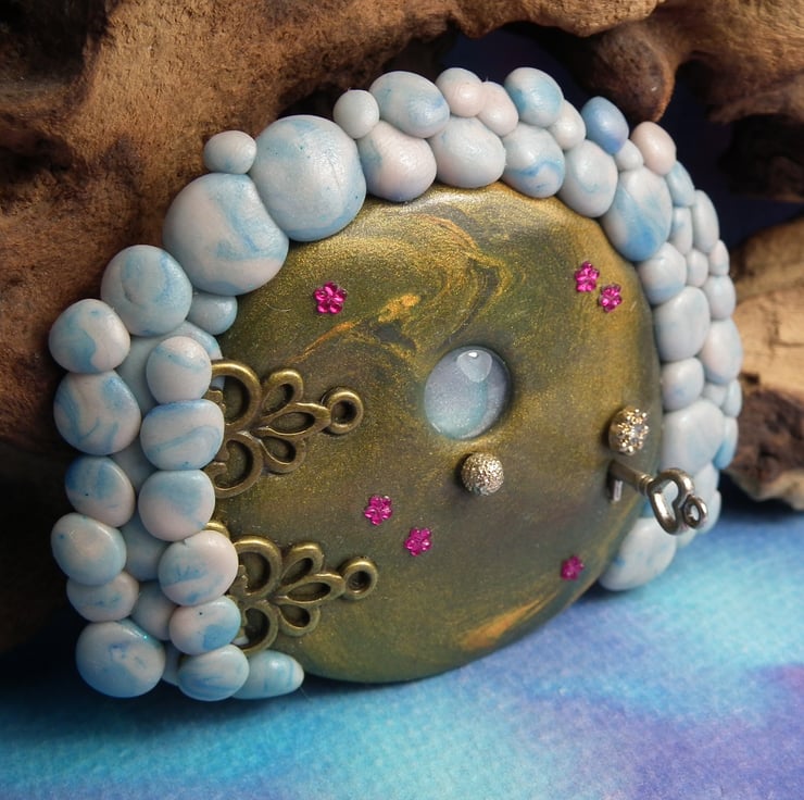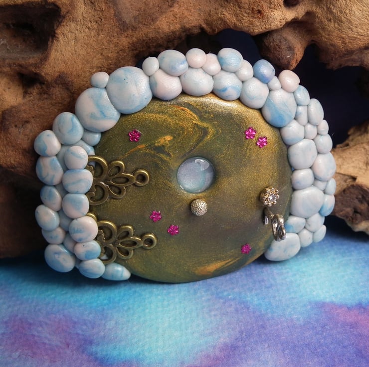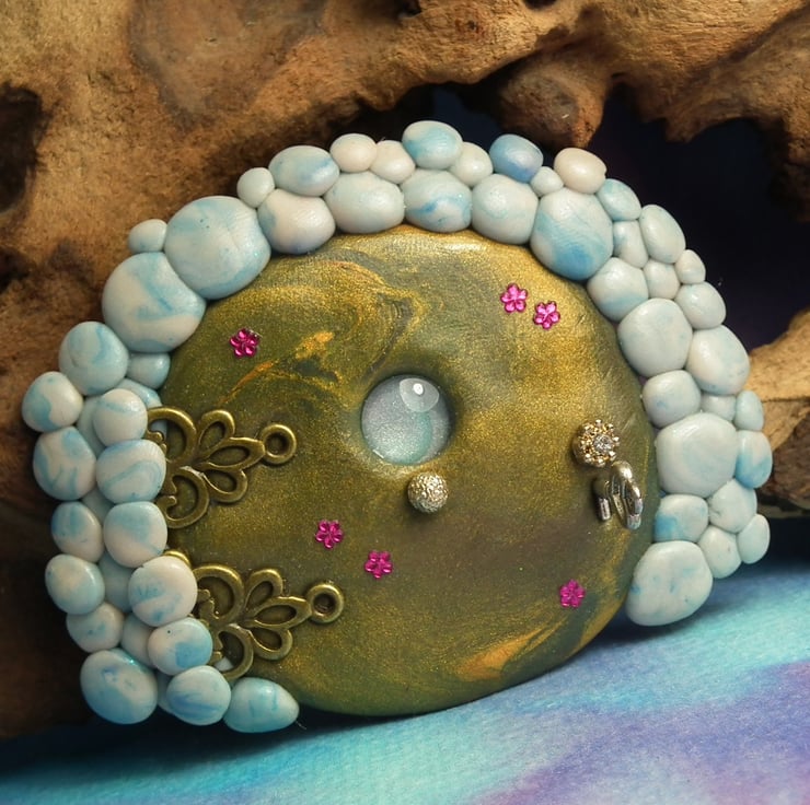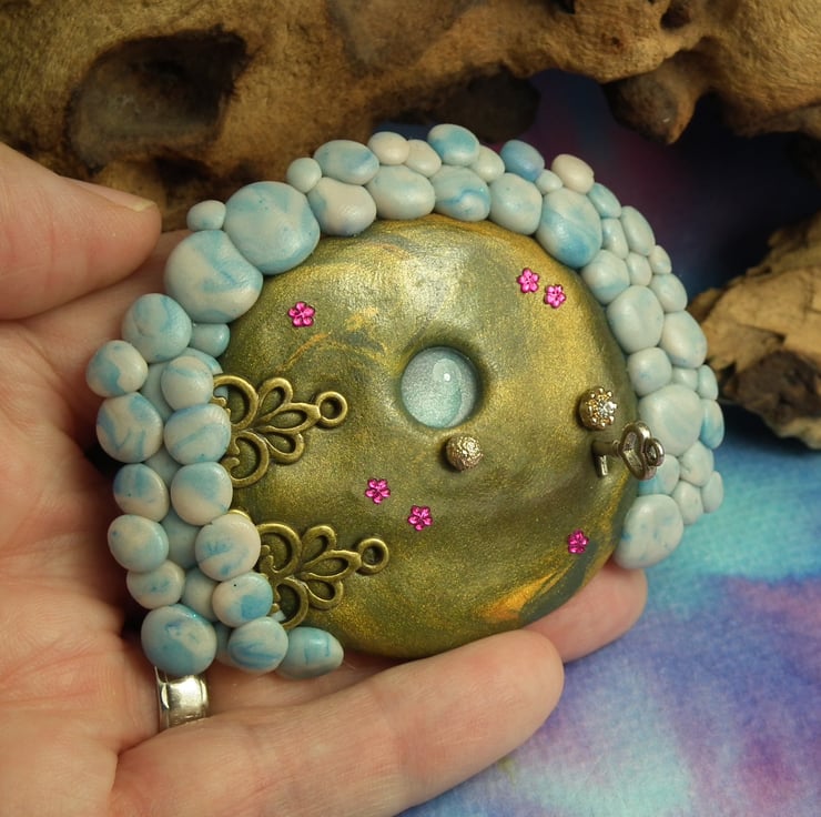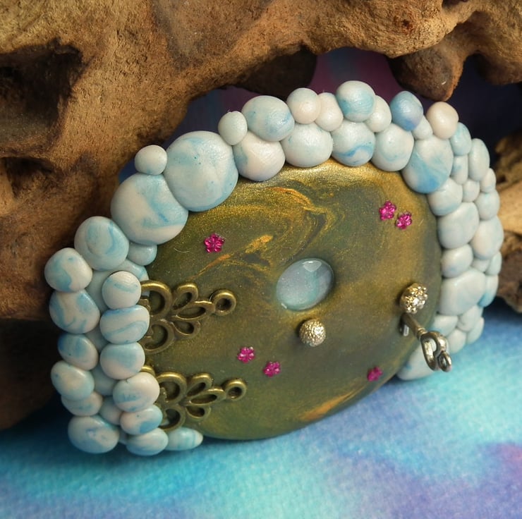 This is a 'one of a kind' creation having been entirely handmade without the use of moulds here at my studio on the Sussex Coast. Modelled with Prosculpt polymers, painted with heat set paints before sealing with lacquer, The portal is two and a half inches high and can be attached to any flat surface with the fixing pads on reverse.