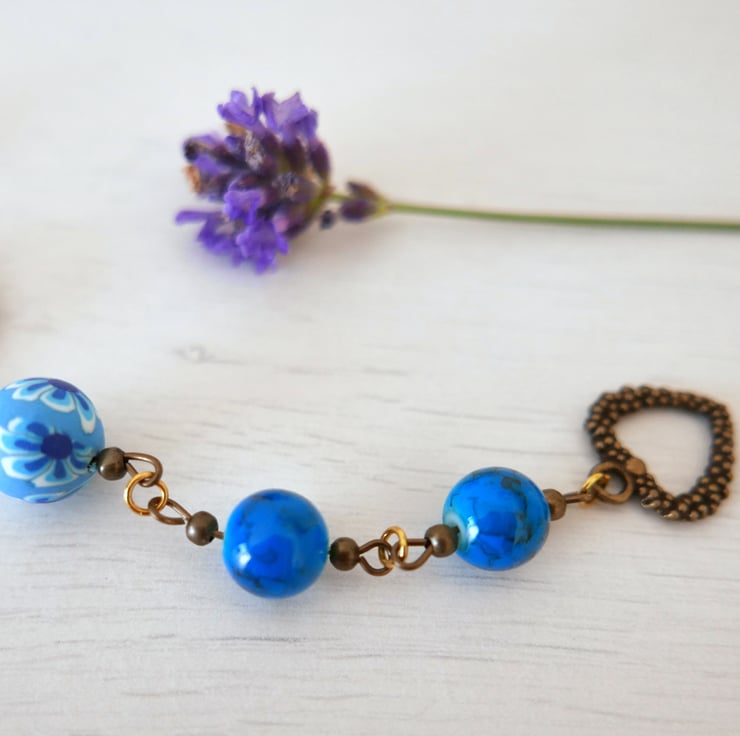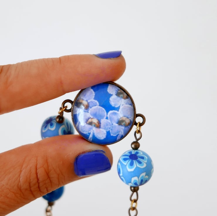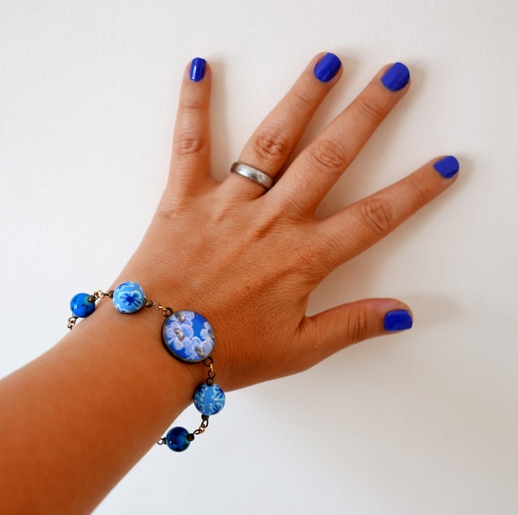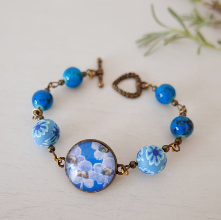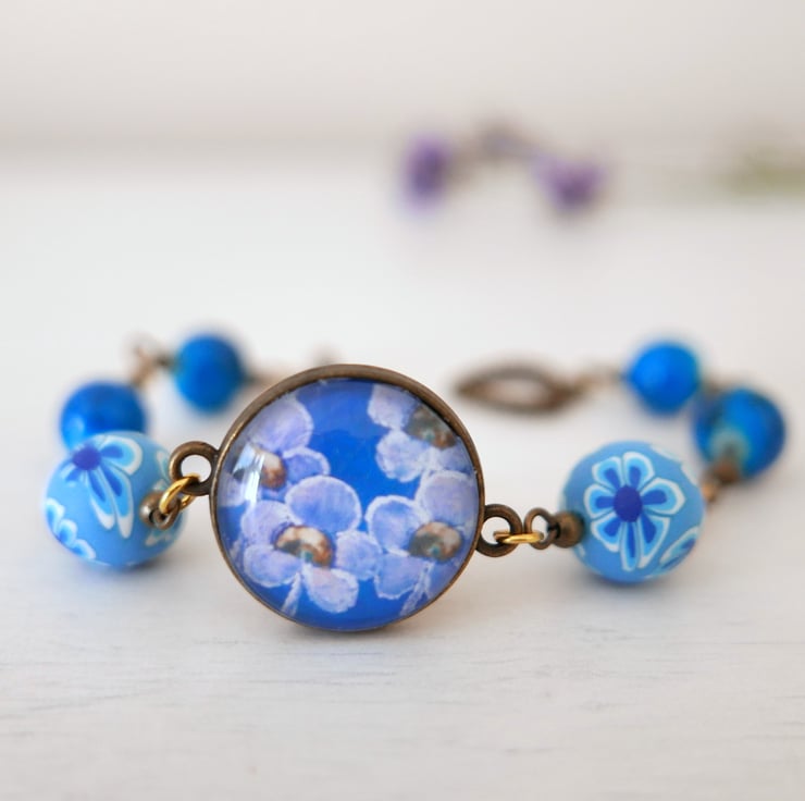 I created this bracelet around a pendant connector featuring an art print after one of my original floral paintings. The image is printed at home and it is fixed onto the round bezel and under a glass cabochon. I also used two polymer clay beads with flowers and some glass electric blue beads. The bracelet is approx 7.75" long and it finishes with a pretty heart clasp toggle.