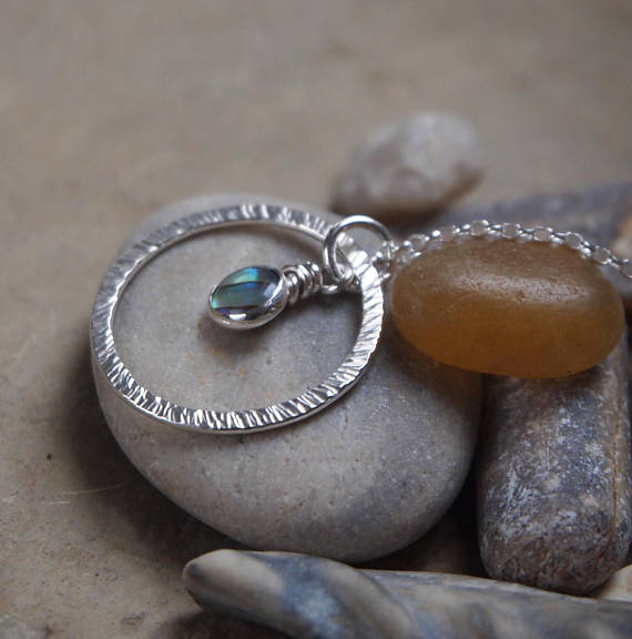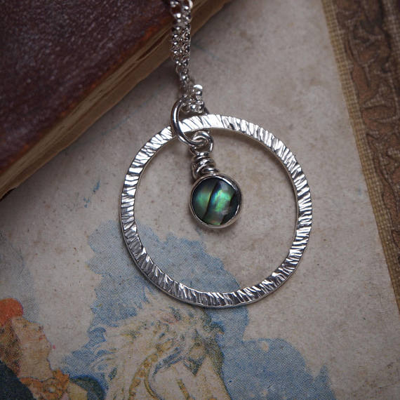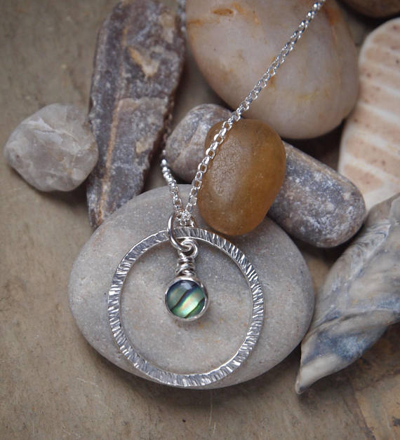 A beautiful piece of natural abalone (paua) shell has been set in a fine silver cup and suspended within a hammered sterling silver ring.