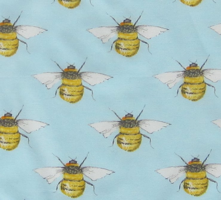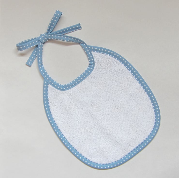 Babies bib in bee pattern on a light blue background. Edged with blue and white spotty bias binding and backed with white towelling.