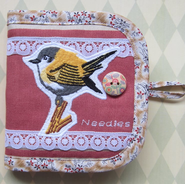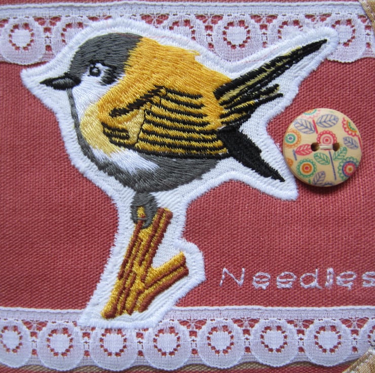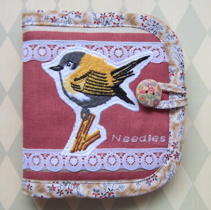 Lightly padded sewing needle case with appliqued machine embroidered bird and lace on a rust brown background. Edged with a floral bias binding.