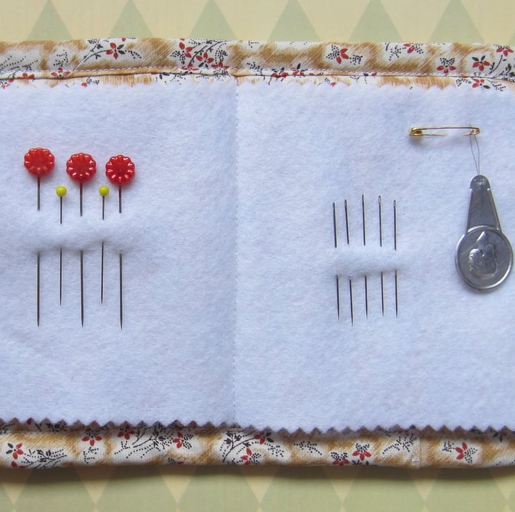 Inside it is lined with matching floral fabric and there is a white felt page complete with pins, needles and a threader.