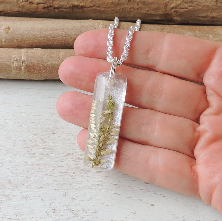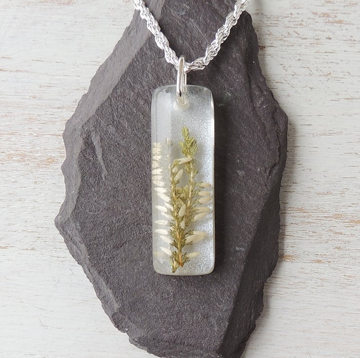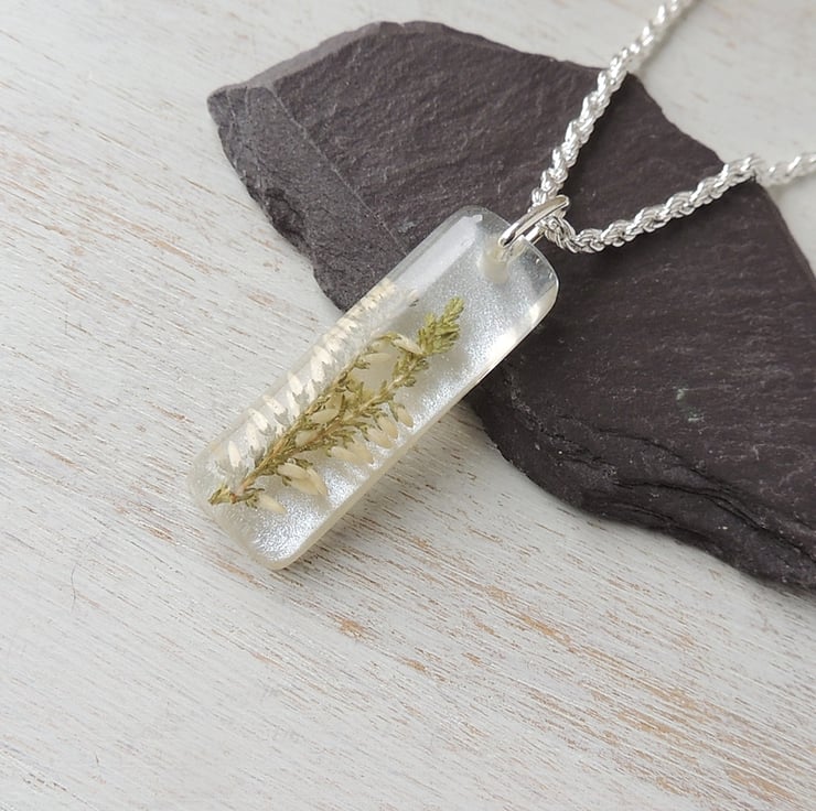 The Heather is from my garden that I have picked and pressed to use in my flower jewellery. I've cast two little sprigs of the heather in resin, finishing with a frosty white colour background. I then drilled a hole in the top and added the pendant bail.