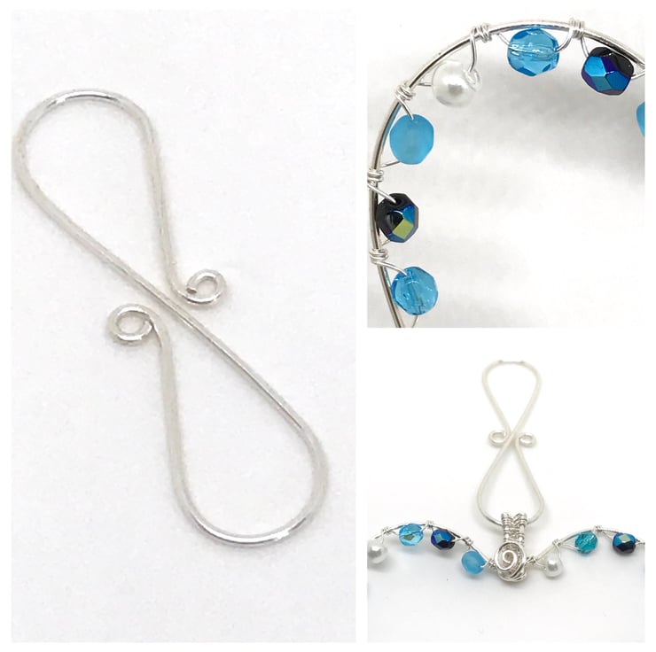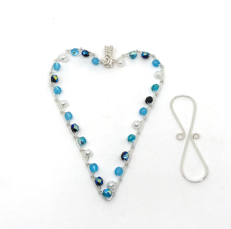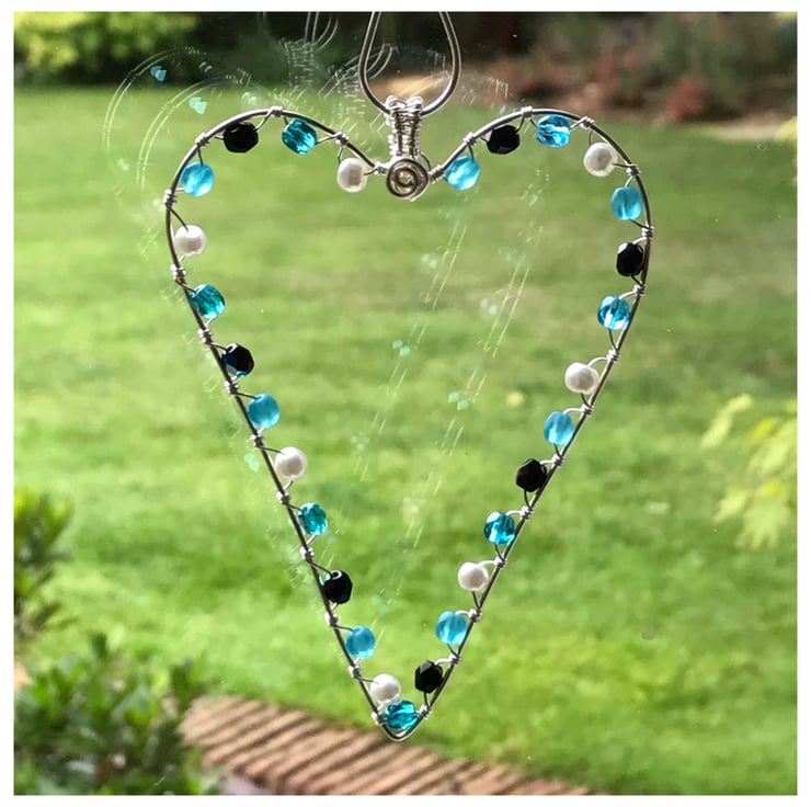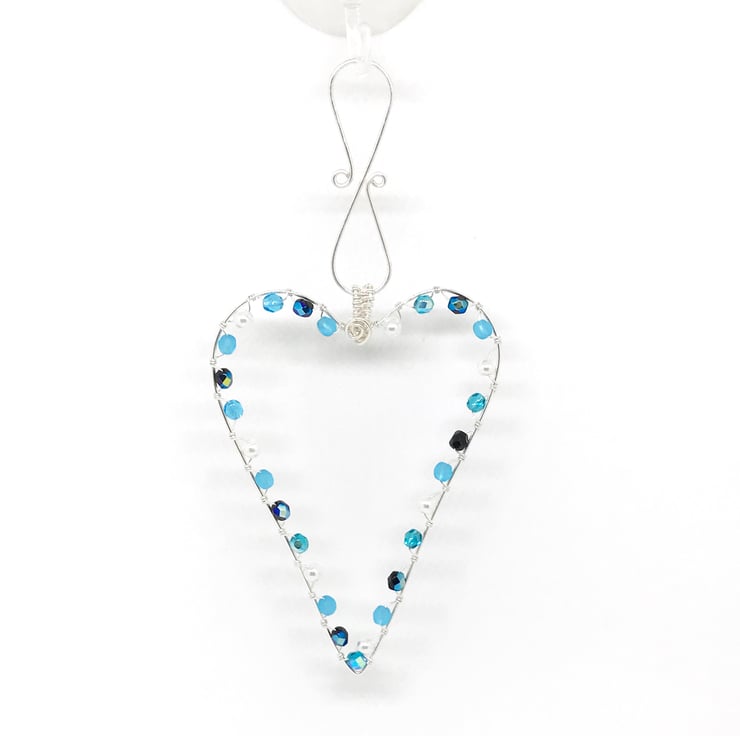 I have created this pretty heart with silver plated wire which I have formed into a heart shape. I have embellished the heart with a variety of blue Czech crystal beads and glass pearl beads which sparkle in the light. These glass beads are wrapped around the heart with fine silver plated wire.