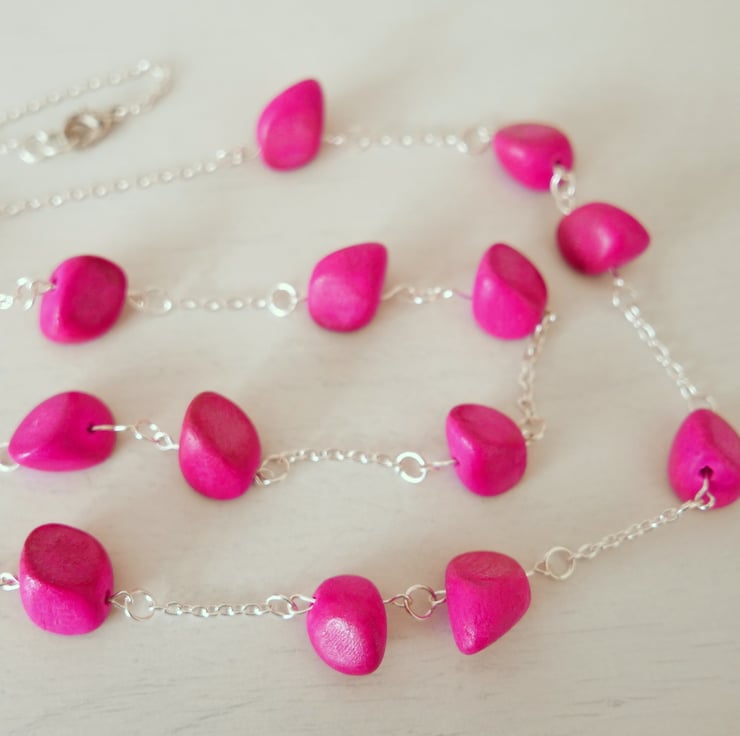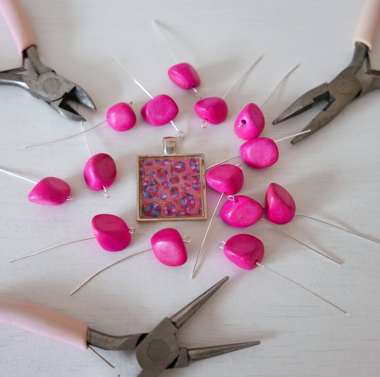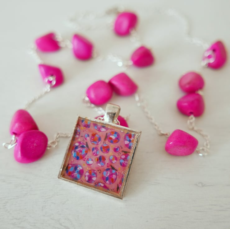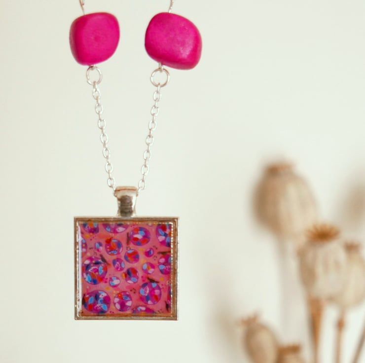 This is a pink pendant necklace handmade by me using a resin pendant featuring a print after my original painting 'Morning Choir' and dyed wood beads and silver chain to compliment the style and the colour of the image. The pendant is 1" square and the necklace is approx 28" long. The pendant necklace comes wrapped in tissue paper and placed in an organza bag.