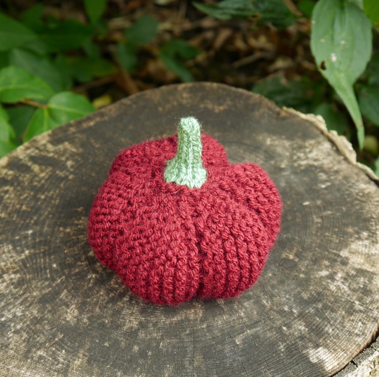 It measures approx 9cm in height to top of stem and 33cm around. It is filled with toy safe CE tested polyester stuffing. There is also a large knitted pumpkin in my shop (see photos)