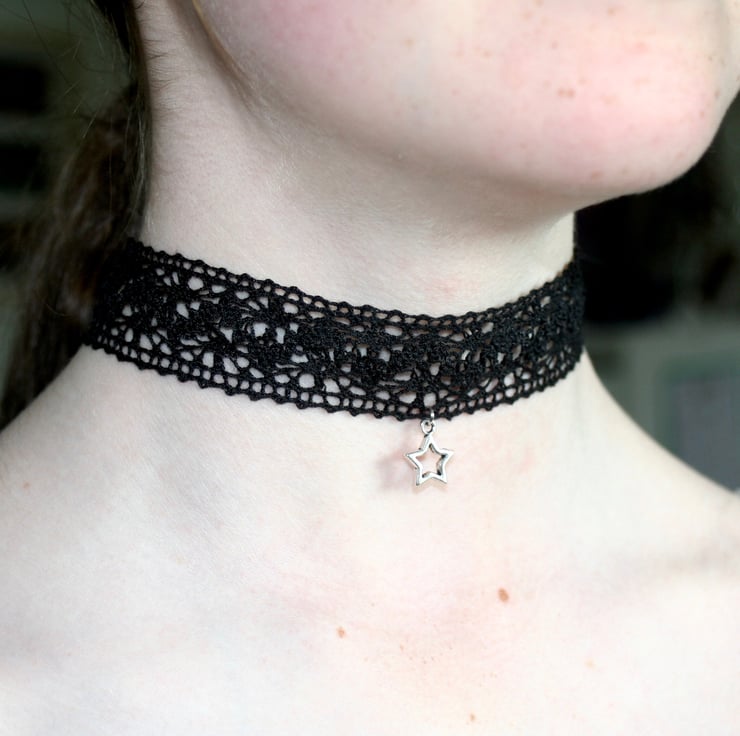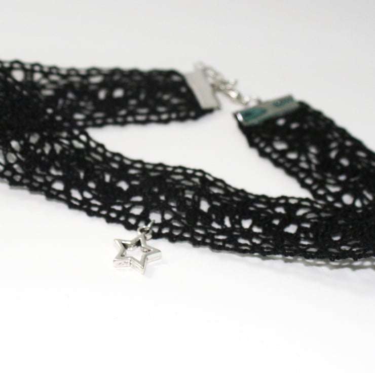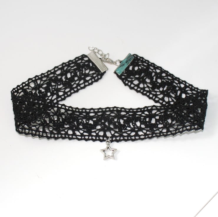 A delicate lace ribbon was used to make this fashionable choker, which is finished with a silver plated star charm.
