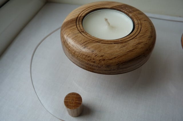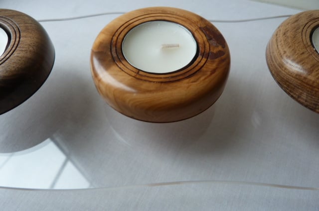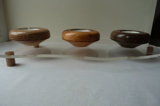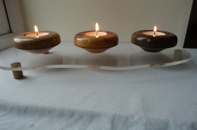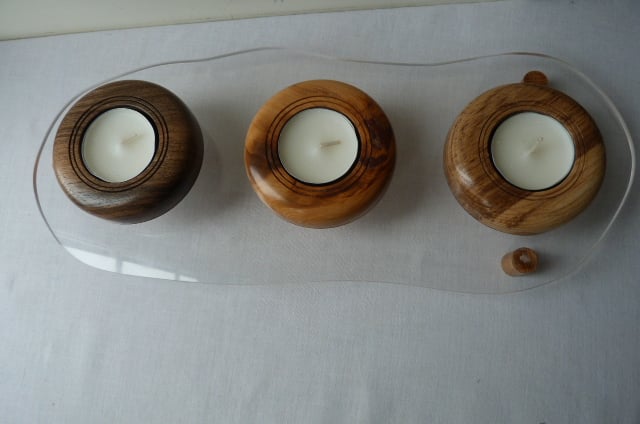 THREE 3INCH TEA LIGHTS IN ENGLISH HARDWOODS WHICH ARE ASH, YEW AND WALNUT ON AN ACRYLIC HAND CRAFTED CONTOURED AND POLISHED BASE PLATE, SUPPORTED BY THREE OAK MINIATURE COLUMNS. A VERY ATTRACTIVE BUT FUNCTIONAL PIECE, A WELCOME ADDITION TO ANY ROOM.