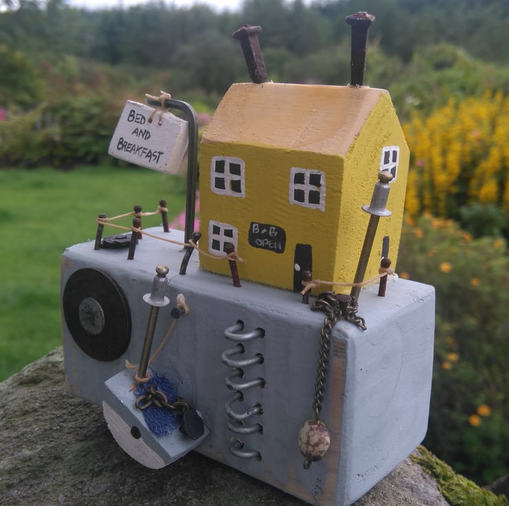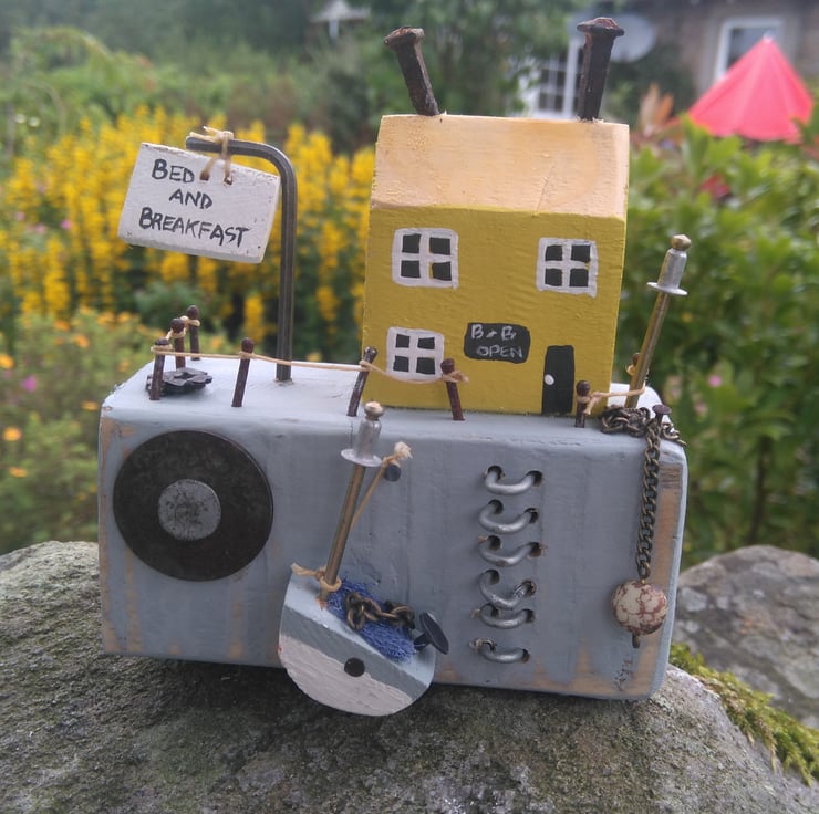 This cute wee bed and breakfast is made from scrap wood discarded items etc to give you a mini version of a dream Bed and Breakfast by the sea... kippers for breakfast !!