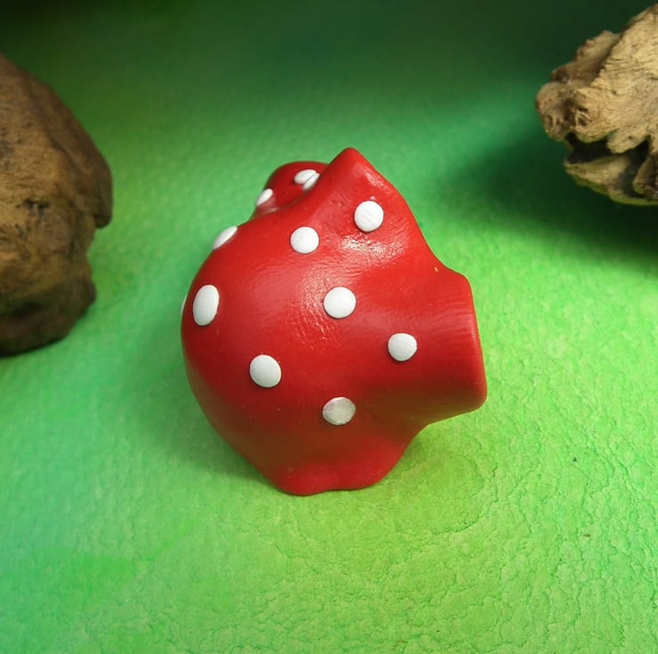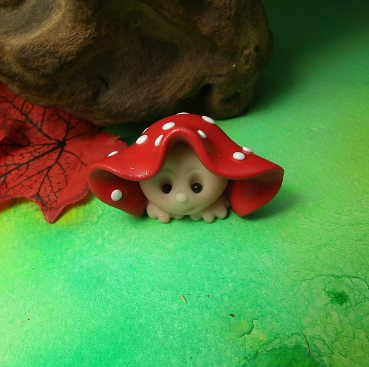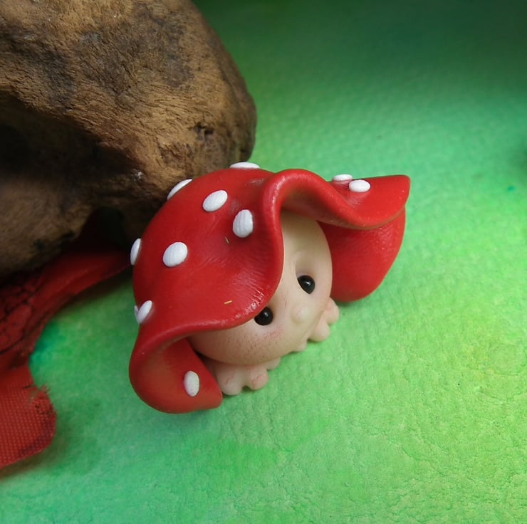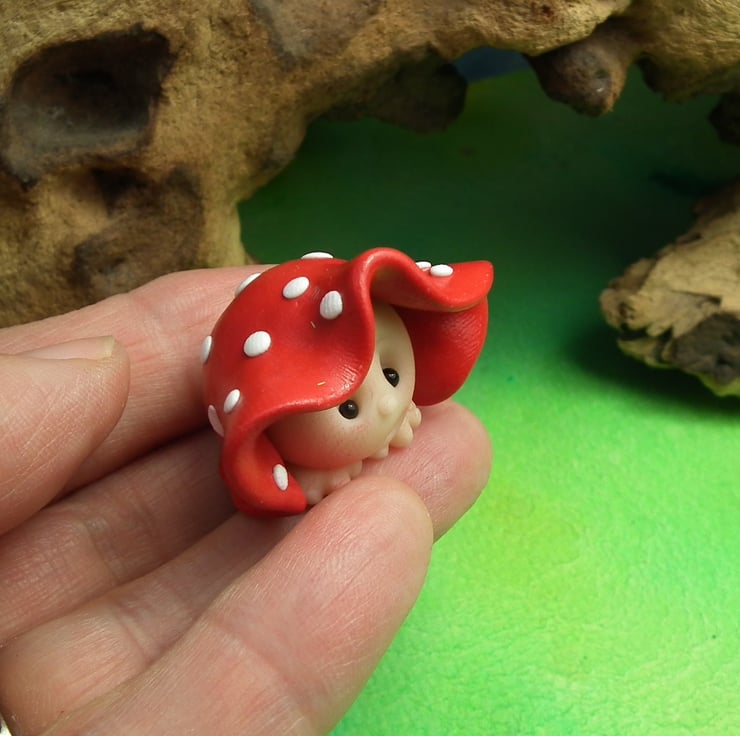 This is a 'one of a kind' creation having been entirely handmade without the use of moulds here at my studio on the Sussex Coast. Modelled with Prosculpt polymers, painted with heat set paints before sealing with lacquer, Rozz has sparkling black onyx eyes. Rozz the Toadstool Gnome is just one inch tall.