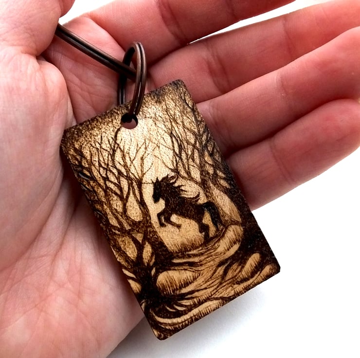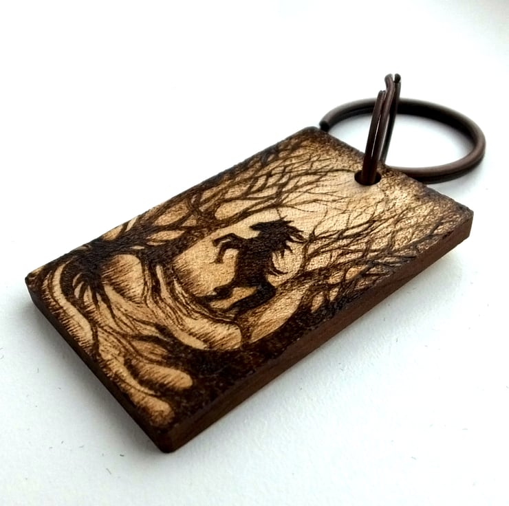 A lovely key ring with a pony or horse rearing up in woodland or a forest. The design is burned into the wood using the technique of pyrography - wood burning. Great for an equestrian, rider, nature lover, or for a wood (5 years) anniversary.