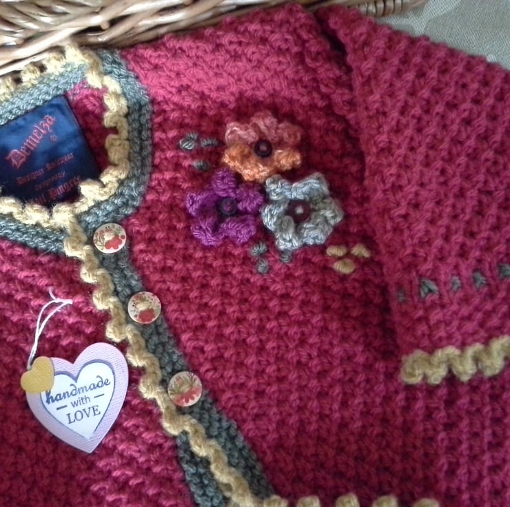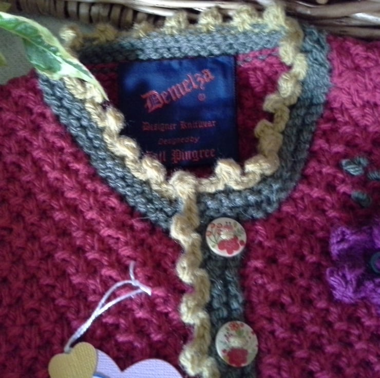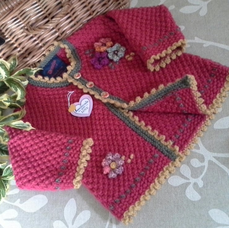 This lovely practical baby girl's jacket has been designed and hand crafted by myself. I have used branded British aran yarn containing 20% wool / 80% premium acrylic mix. All yarns used are guaranteed machine washable by the yarn manufacturers at low temperature. On the reverse side of the Demelza branded garment label the care instructions are woven within it for lasting reference and as proofof it's origins if gifting.