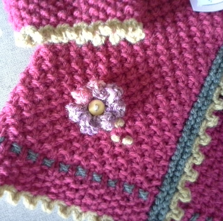 I have used genuine wooden buttons which have a lovely delicate flower design print on them to compliment the garments overall design. I have embroidered cross stitching around the bottom of the garment and sleeve edges, with further embroidered detail and hand crocheted flowers with embroidered French knots in their centres complimentedwith picot edging.