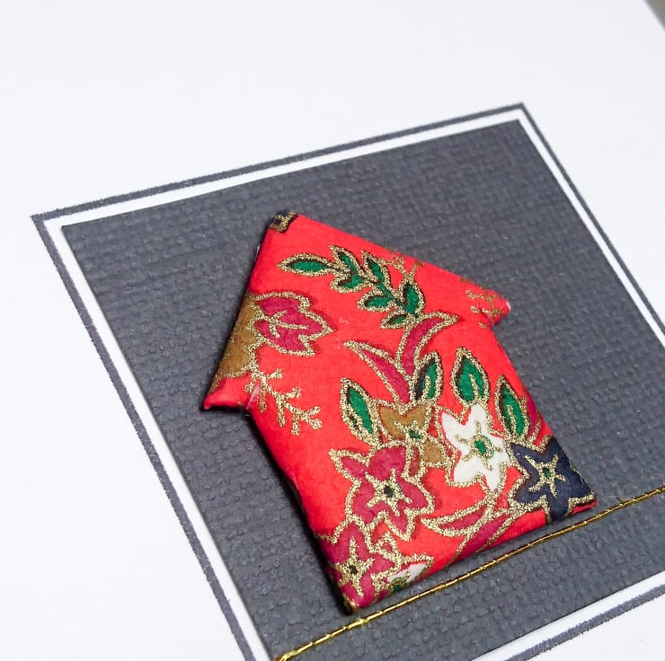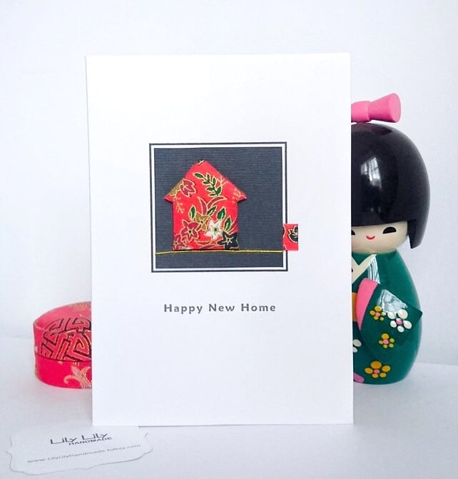 A stylish new home card with a Japanese inspired design. This card features a soft padded house motif that has been handcrafted by Lily Lily Handmade using beautiful red Japanese paper. The motif is set against contrasting charcoal grey textured paper and embellished with a gold trim.