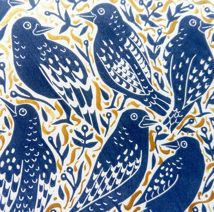 Limited Edition of just 15 in the new colour option of deep purple and gold for my Starlings design. Each print is printed using a hand powered traditional printing press, one at a time. I then, using a goose feather quill add hand drawn dots and fronds in a shimmering gold ink, every single one is different!