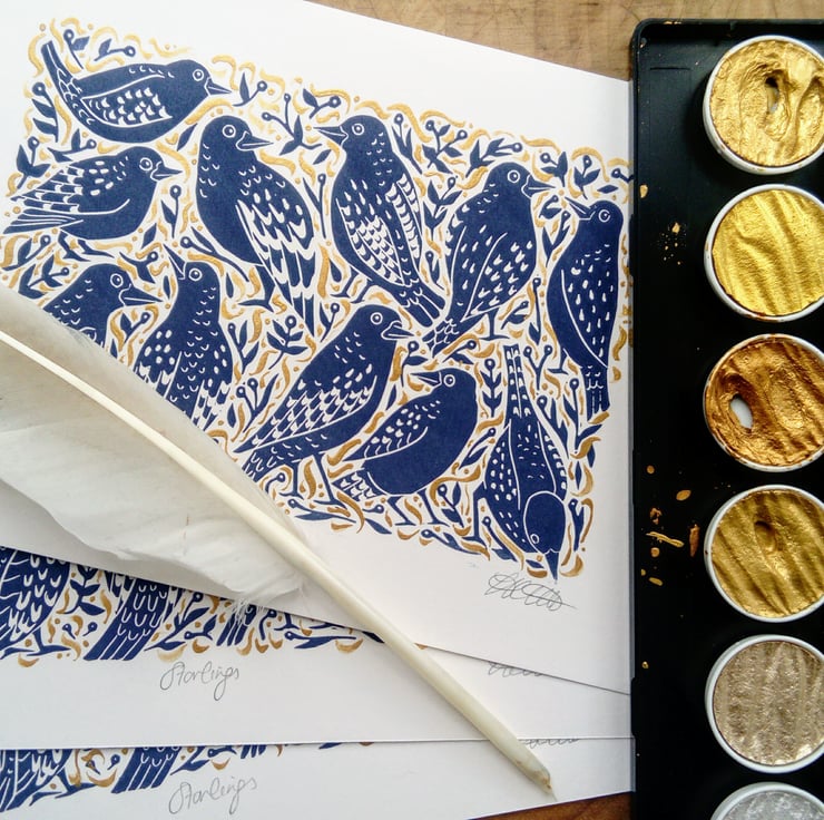 I am often inspried by nature and have a passion for botanical designs and I loved the idea of using a feather to create the hand painted details on the print. I like to put imagination into all the prints I do, each starling has it's own expression and the gold fronds and dots are my way of making each one completely unique!