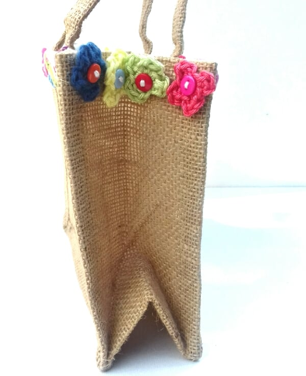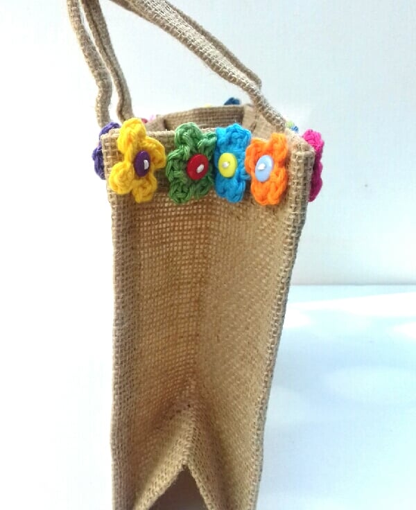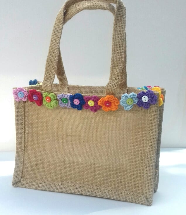 This jute bag is decorated with tiny crocheted four and five petalled flowers with button centres. The cotton flowers are held in place by the firmly hand-stitched buttons. The bag itself measures about W20 X H14 X D10 cm. It can be used again and again as a pretty way to present a gift. To keep postage to a minimum the bag will be posted to you with very little ceremony in a manilla envelope.