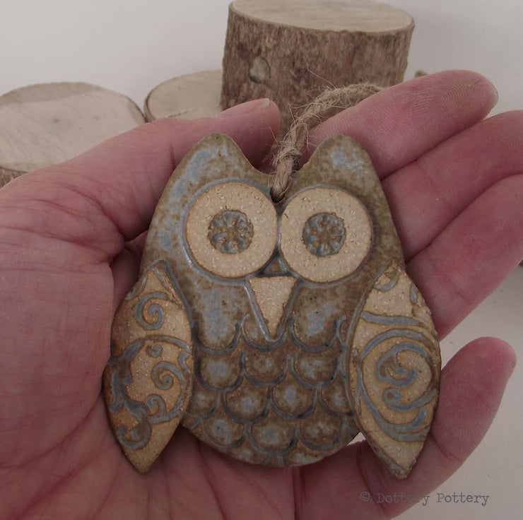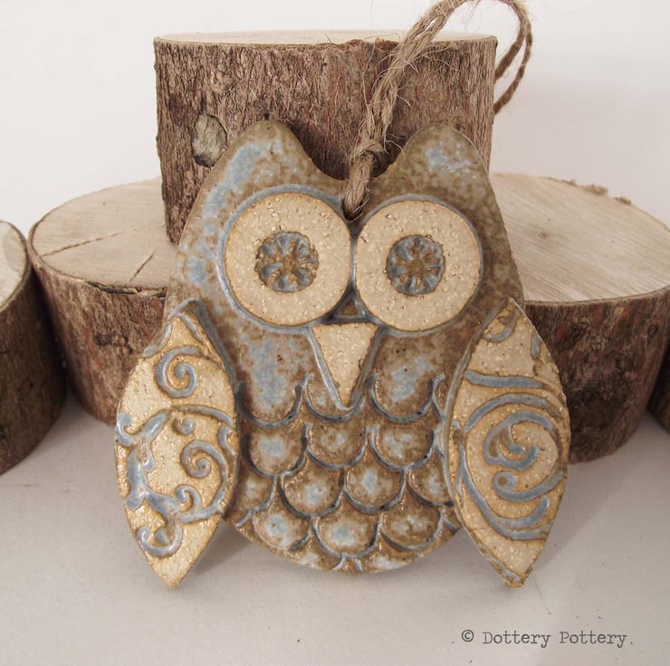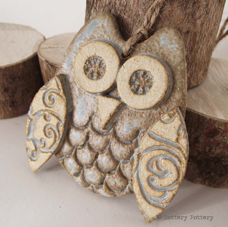 This cute little owl is made from white earthenware clay. Each part has been embossed with pattern and then cut from hand made templates.