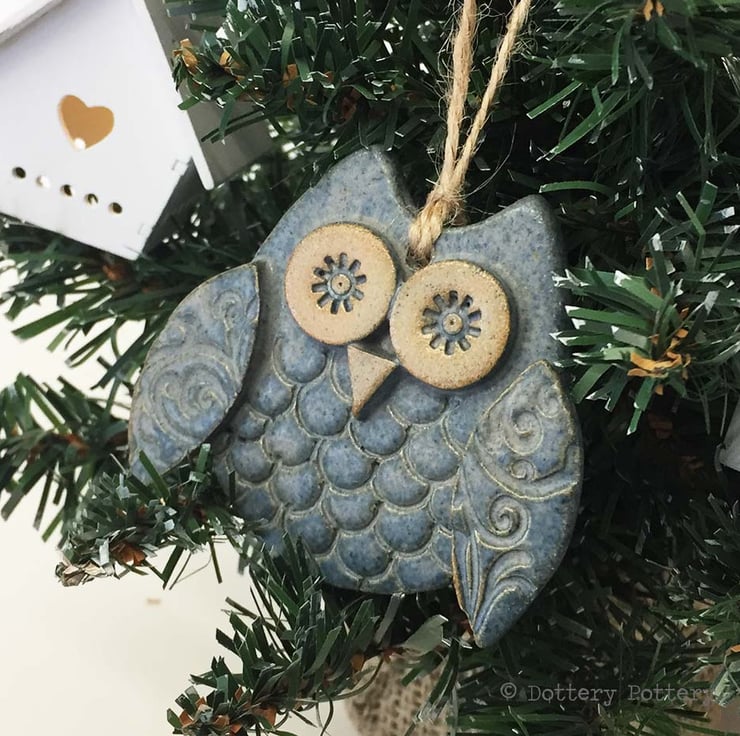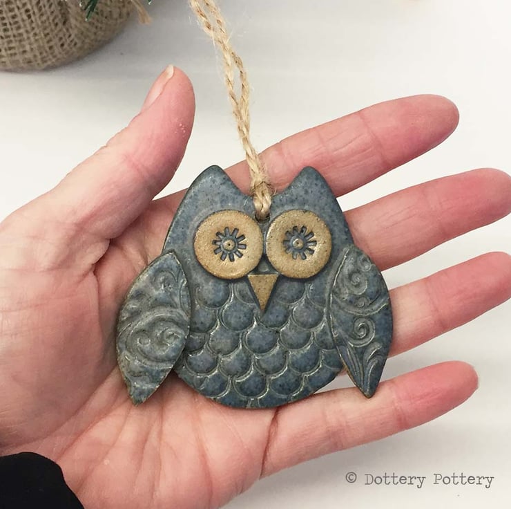 This cute little owl is made from white earthenware clay. Each part has been embossed with pattern and then cut from hand made templates.