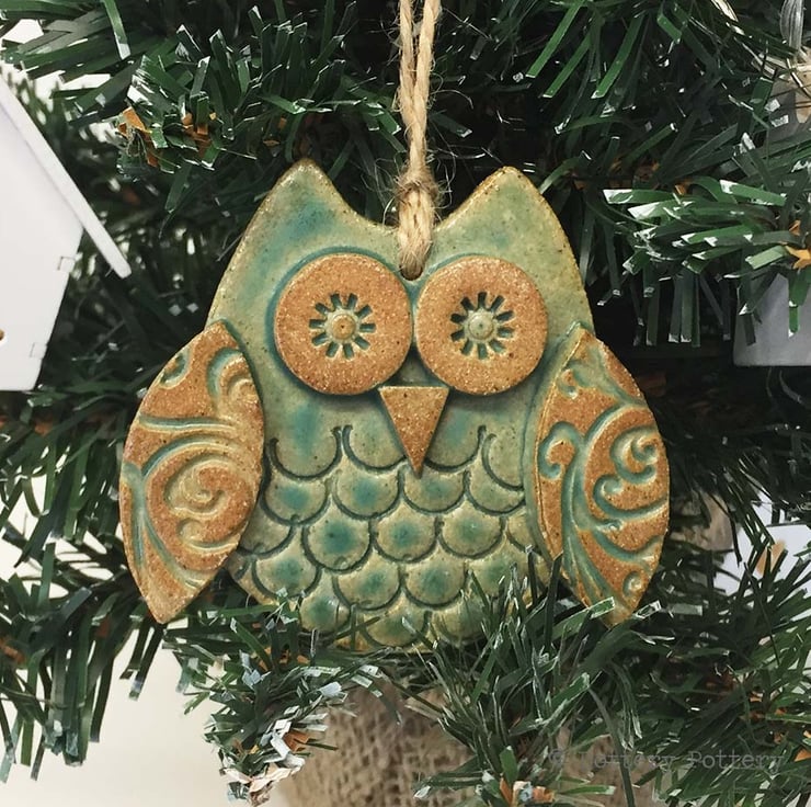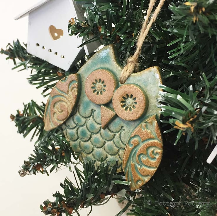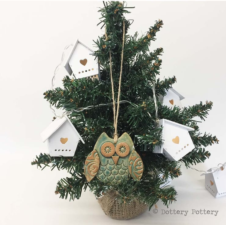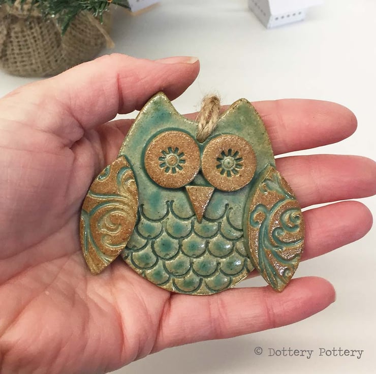 This cute little owl is made from white earthenware clay. Each part has been embossed with pattern and then cut from hand made templates.