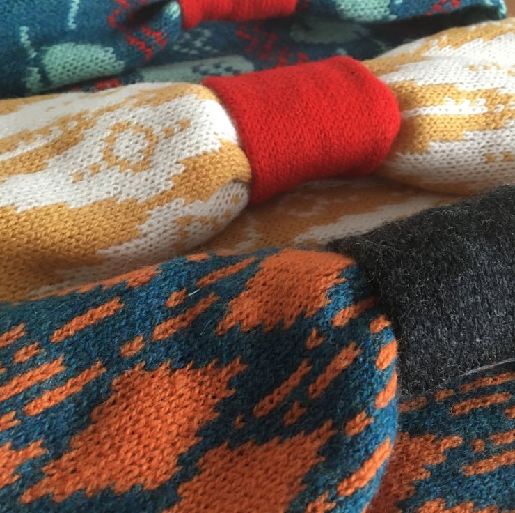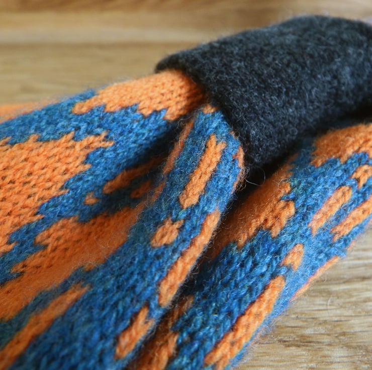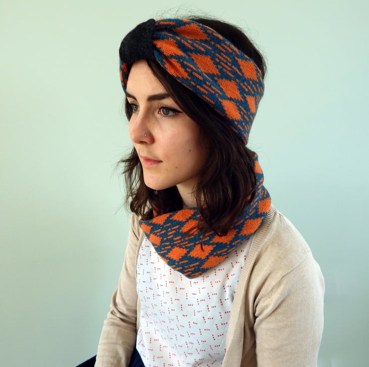 A pure Lambswool Headband in the Lieki Pattern - created in a deep green-blue and vibrant orange.