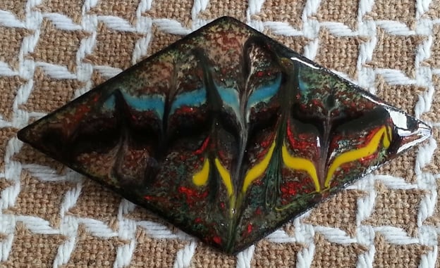 After building up a base coat of red over several layers of clear enamel on the copper shape I then fired rods of turquoise, black and yellow over it and when the piece was ared hot, in the kiln, I drew through these with a steel tip to generate the pattterns you see. Thewre is a textural element to the brooch where the enamel has set smooth but not flat on the surface. This also creates an interference with the play of light on the piece, adding to its complexity.