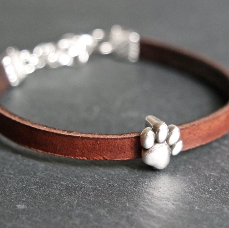 A lovely dark brown leather bracelet with a small dog paw slider bead in silver.