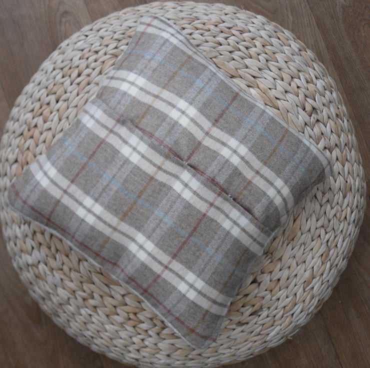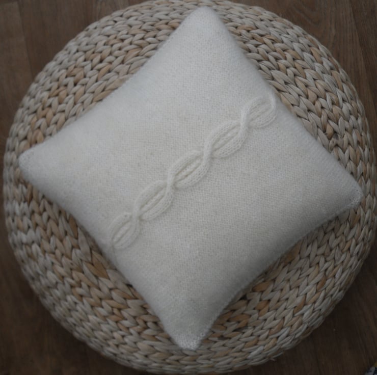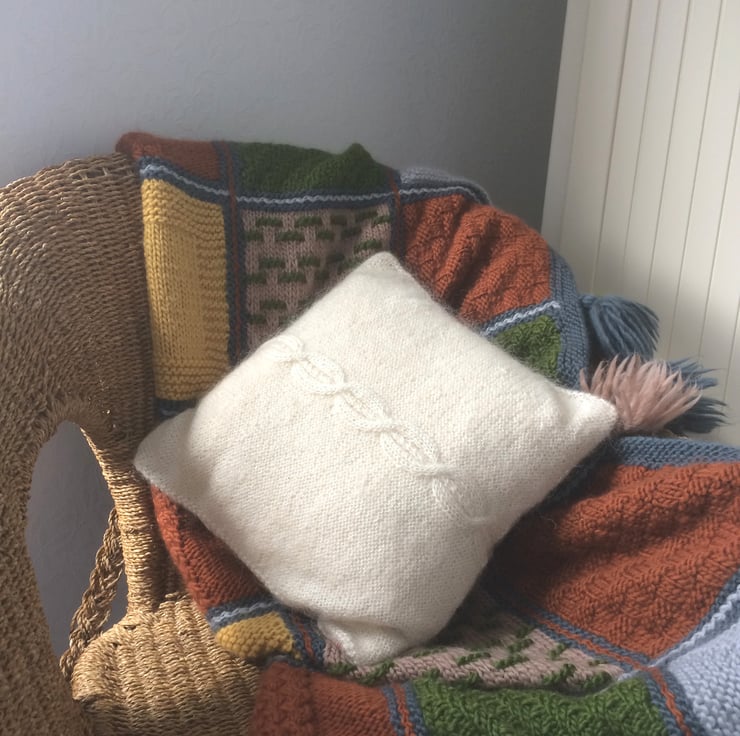 A gorgeous intricate hand knit cushion cover / throw pillow. A stunning piece of design work and cable knitting. Knitted in a gorgeous cream mohair with a beautiful cable running down the centre front of the cushion. The back is finished in a well coordinated tartan in subtle browns and cream, fastening with 3 press stud fastenings. Size 14" x 14"