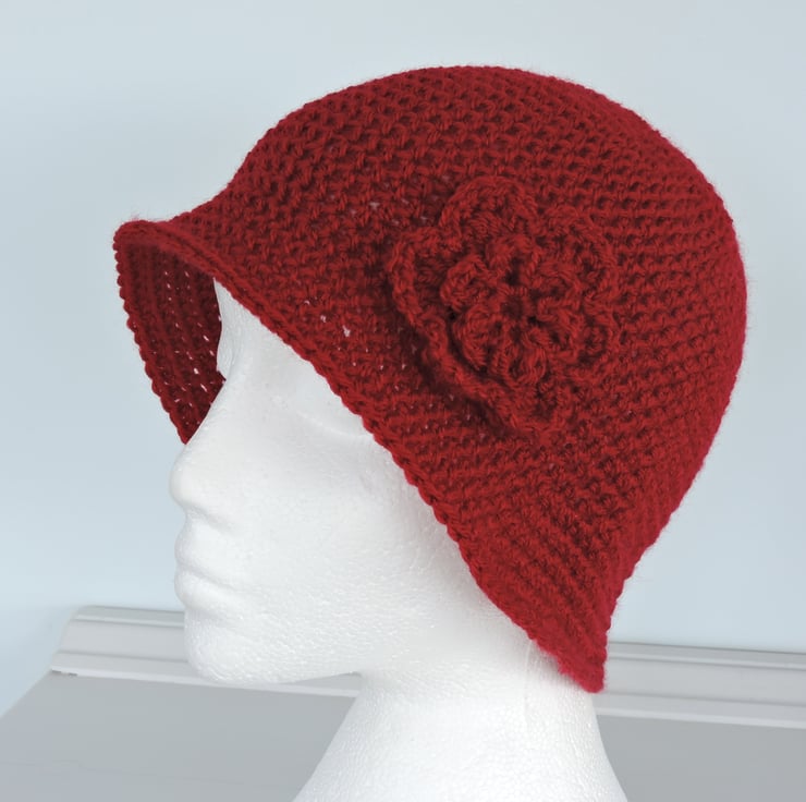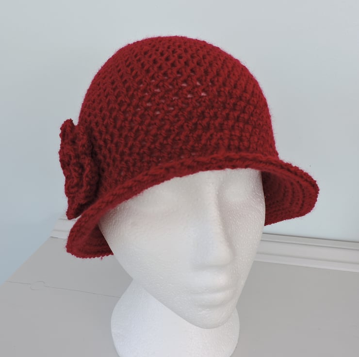 This cloche hat is crocheted in a soft acrylic dark red yarn. It's finished with a double layer crochet flower.