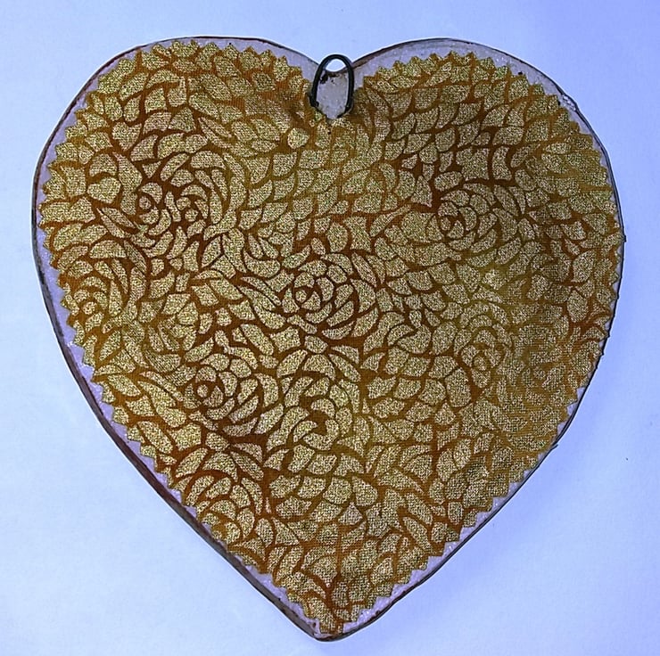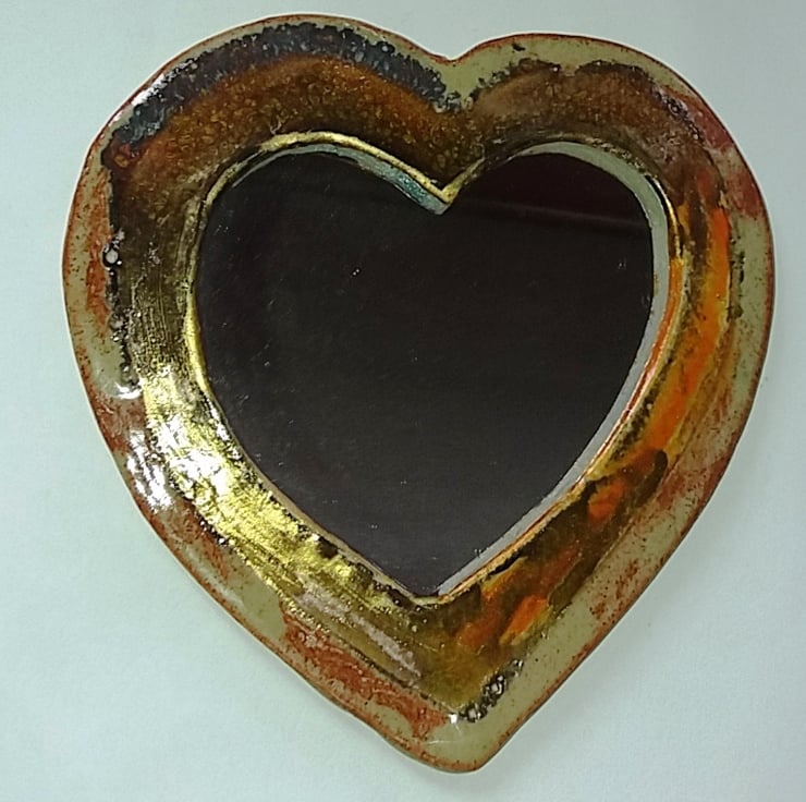 A ceramic framed heart shaped wall mirror measuring 14cm across by 14cm long.