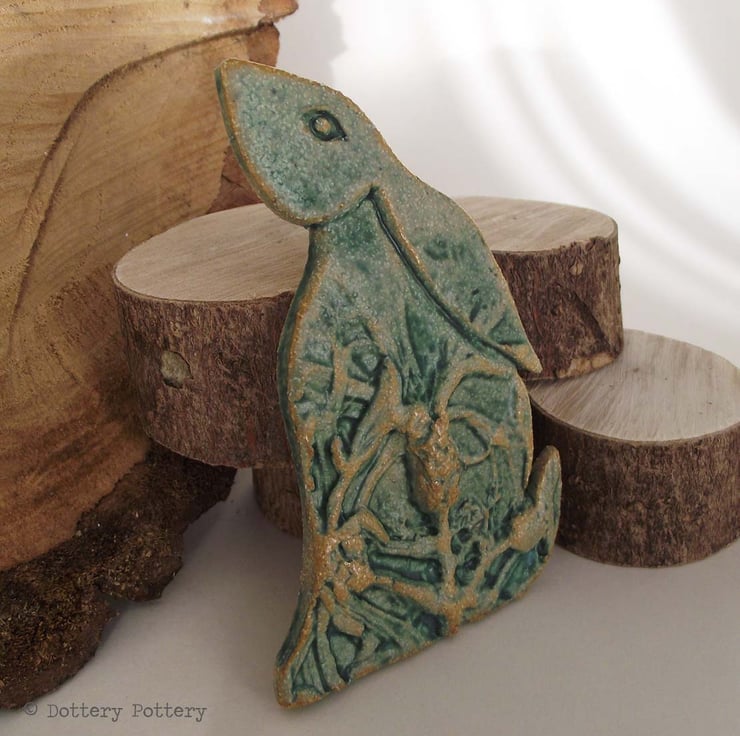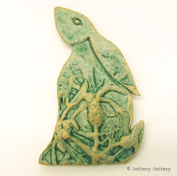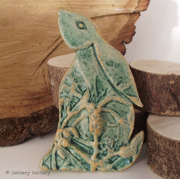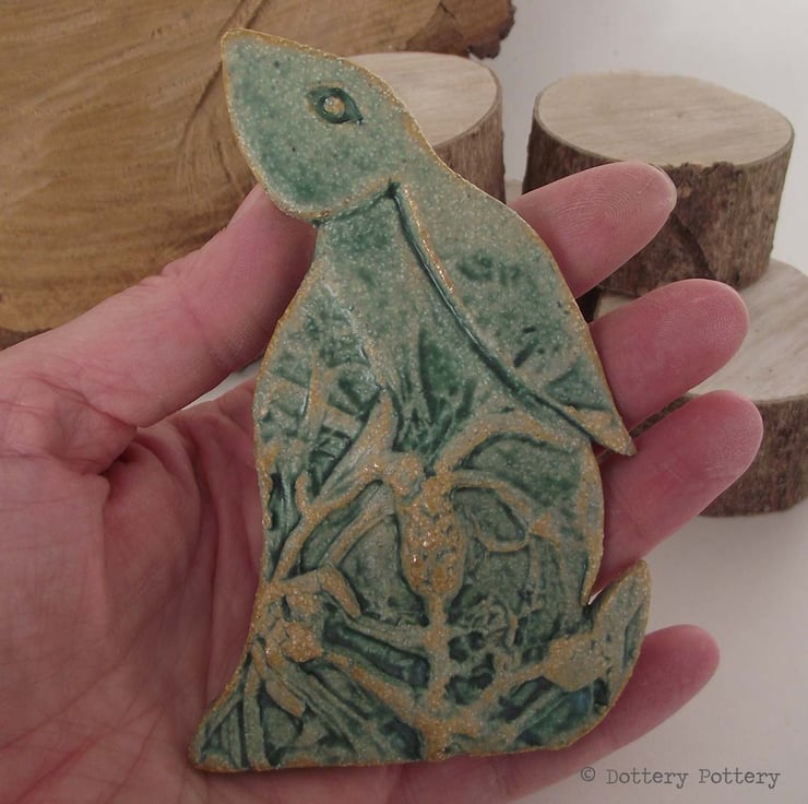 This delightful moon gazing hare is made from textured stoneware clay and decorated with pattern. It is cut from a hand drawn template.