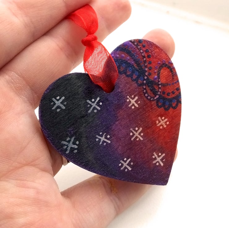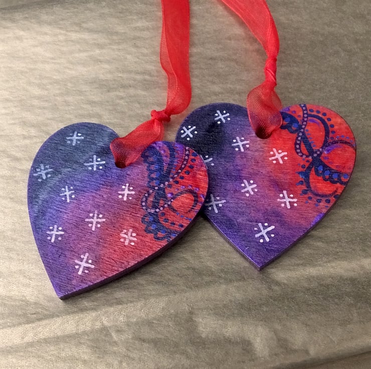 A pair (2) of wooden heart shapes that are painted by hand in rich purple and red colours and have swirled patterns, dots and snowflakes. Ideal for Christmas or Yule. Completely unique, and created by myself. No two are the same.
