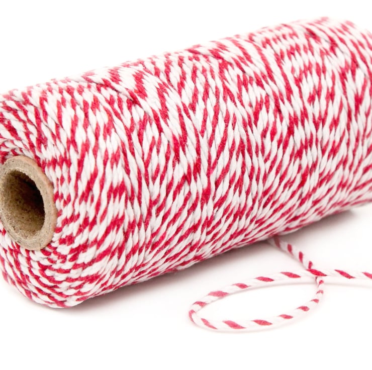 10m Red and White Baker's Twine. This twine is 2mm thick. The twine is wrapped around a handy card spool. Card Spools are a fantastic way of keeping your twine nice and neat and avoiding tangles!