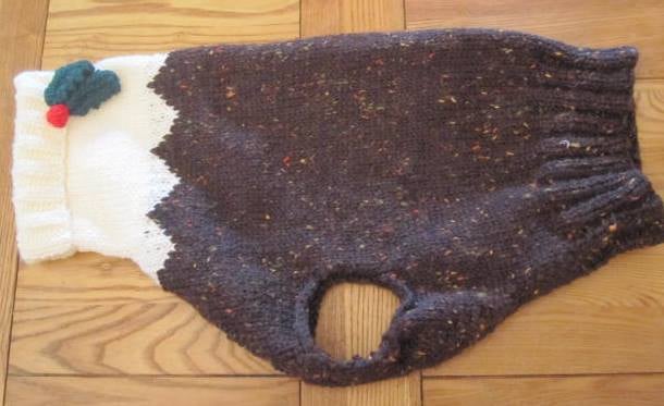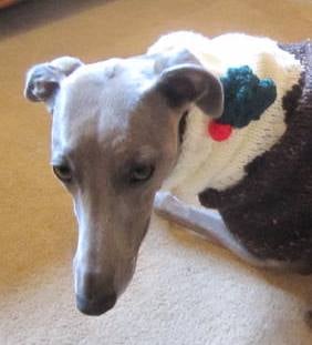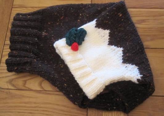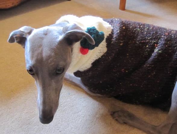 A lovely cosy (and a wee bit silly) Christmas Pudding jumper, with holly & berry garnish. knitted to my own design, especially for a slim whippet.