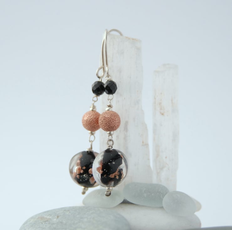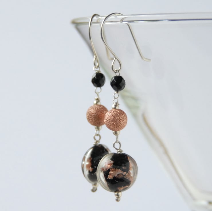 These drop earrings feature black and goldstone murano beads with stardust effect copper and faceted onyx beads finished with simple handmade sterling silver hooks. The murano beads have a black glass core with small speckles of the brown goldstone (goldstone is actually a type of glass) for a touch of sparkle which has then been cased in clear glass for durability, the colour of the goldstone is picked up with the copper beads which add a touch more sparkle with their stardust finish. Could easily be worn during the day or for a night out.