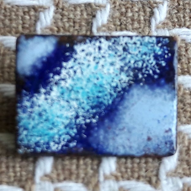 After buiding up a base of layers of clear enamel on the copper shape I have added a layer of dark blue. Over that I have added patterns of pale blue and white scattered with turquoise using the edge of a palette knife to provide a rough stencil to cover parts of the surface.