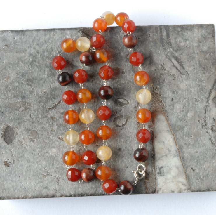 This beaded necklace features a range of agates and tigers eye in an autumnal palette of rich oranges, golden yellows and deep reds. The 8mm beads combined with the colour scheme make the necklace stand out without it being too chunky, each bead is individually rosary linked using sterling silver wire to give the necklace drape and movement allowing the facets on some of the beads to catch the light and sparkle. Finished with a sterling silver clasp it measures approx 16 inches in length (if you would prefer it longer then drop me a message) and comes in a gift box.