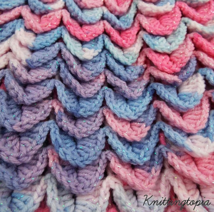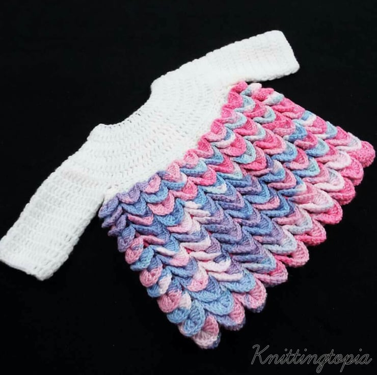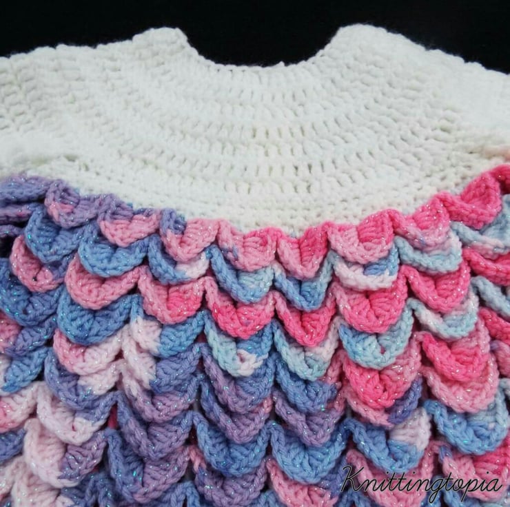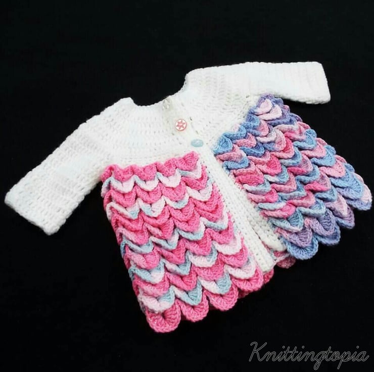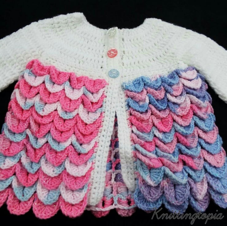 This hand crocheted baby cardigan features the crocodile stitch, also known as dragon scale stitch. The yarn used for the crocodile stitch is in a pretty sparkly blue and pink yarn. The yoke and sleeves have been done in white. It fastens down the front with three buttons, one blue, one pink and one white/clear to compliment the yarn colours.