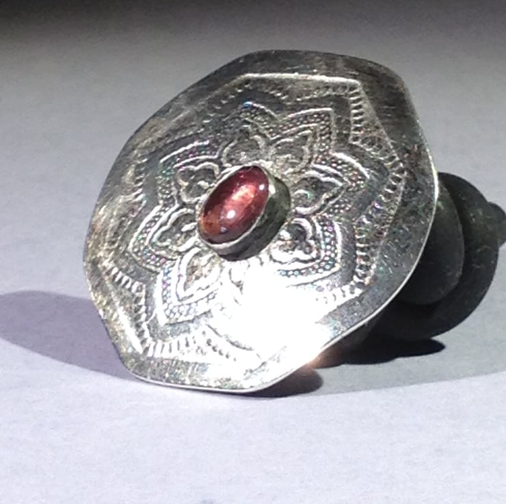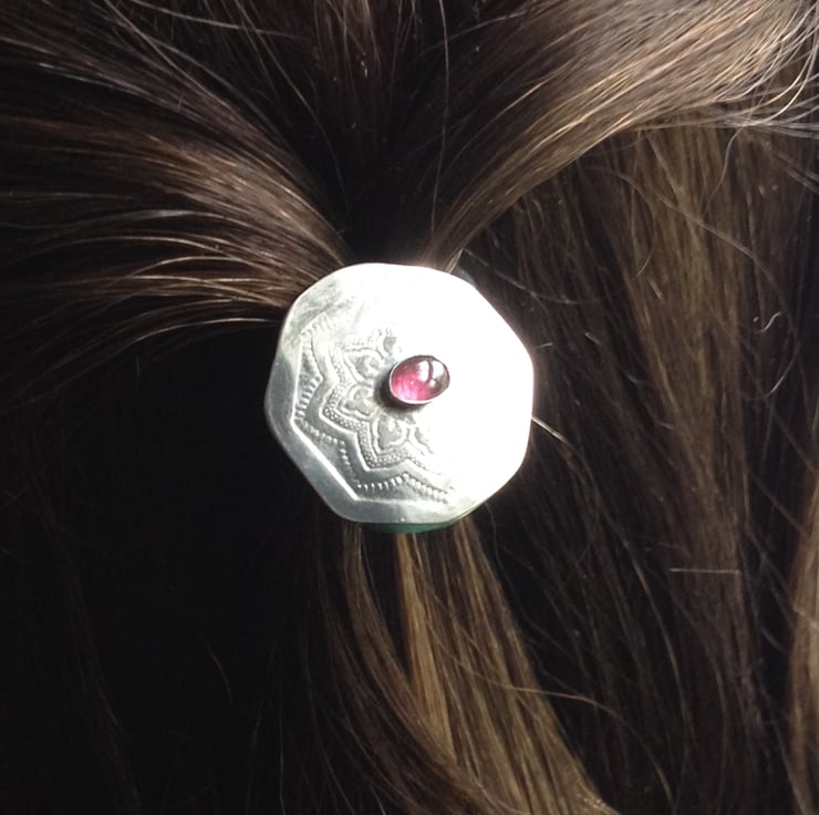 Pretty pink Tourmaline set in Sterling silver. Mehndi textured, silver domed button, long hair tie back. The button measures 25mm and has a slight dome to make it sit nicely at the base of a ponytail or plait. The bands are removable and you can easily replace it with your own favourite type of hair band. Can also be used to secure a scarf or add the button to your hatband.