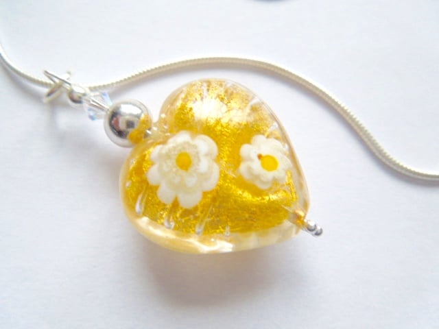 A really pretty Murano glass pendant with a soft gold-foiled Murano glass heart with daisy pattern (20mm) and a sterling silver round bead with glittering Swarovski crystal. This lovely pendant measures 30mm in length and hangs from a sterling silver snake chain (18ins.) It is presented in a pretty organza gift bag all ready for giving. It would make a perfect gift for any occasion. Alll Murano glass used is genuine and sourced on the island of Murano,Venice.